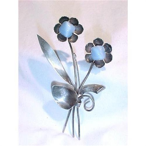 Vintage Sterling Long Stem Flower Pin , Brooch with Glowing Pearlescent Powder Blue Fiber Optic Czech Glass Centers. There is much of this Fiber optic glass being cranked out these day but this brooch is from the old days. </P> <P>It measure 4 in. high and 2.5 in. wide. </P>It is marked "STERLING". <P>Other than a few minor surface scratches to the large sterling leaves it is excellent condition. </P> <P> You will find my selection not only interesting & fun to browse through but very affordable too. </P> <P>Please email me if you have any questions. I am always eager to assist . </P> <P>I offer a short term LAY-A-WAY on certain fixed priced items.</P> <P> </P> <P>You will want to bookmark me! </P> <P>Combine purchases and save money on shipping. </P>