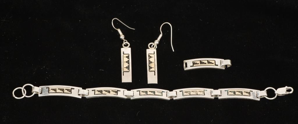 Includes sterling with gold matching bracelet with extra link, earrings, in stair step type design.