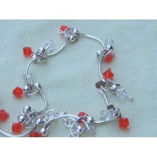 I discovered this beautiful Sterling Silver curved link bracelet and knew it was just the thing for these stunning Swarovski crystals.<p> On each ring between links, I placed a clear crystal on one side and a Hyacinth on the other. It is just a stunning look on!<p>The bracelet measures 7 1/2 inches and I added a sterling link chain, with a sterling heart drop at the end, so it can be worn as big as 9 1/2 inches. Making it also long enough for a most fabulous anklet! <p> Versatile~Stunning
