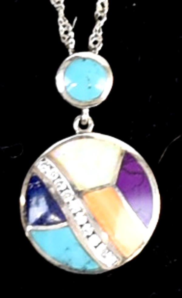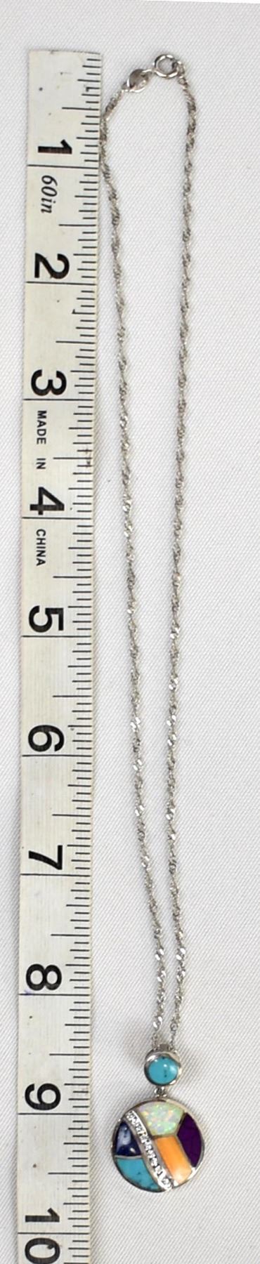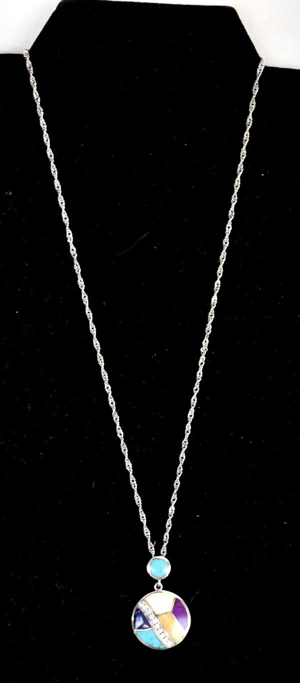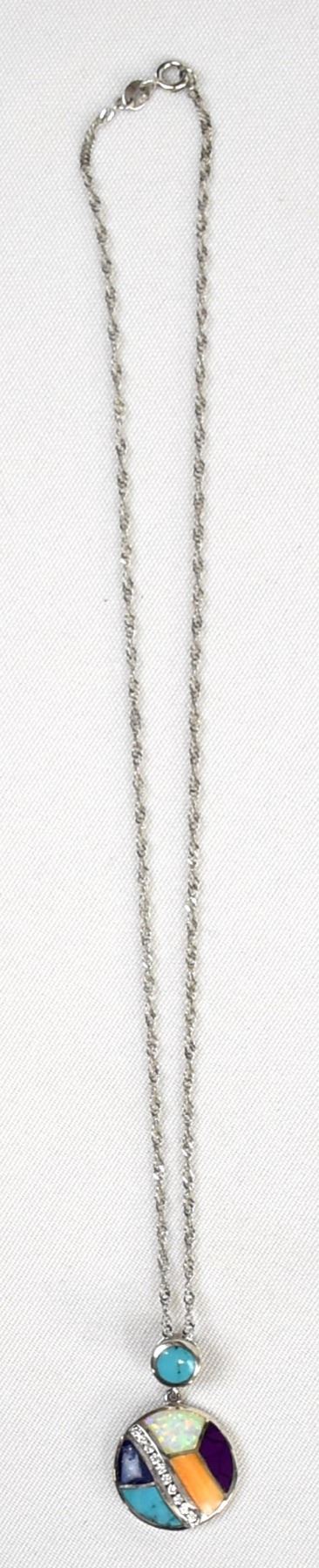 Sterling Inlay Pendant Necklace, pendant measures 1.25''L x .75''D, stamped .925 and hallmarked S*, sterling chain measures 22''L end to end and is stamped .925, inlay includes opal, turquoise, sugilite, orange shell, lapis, and rhinestones