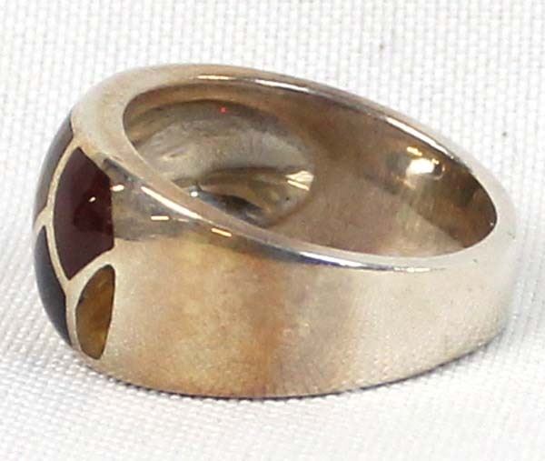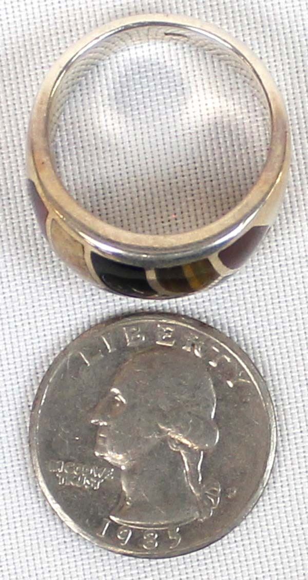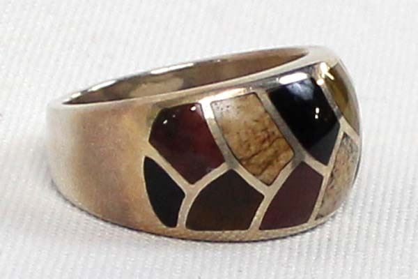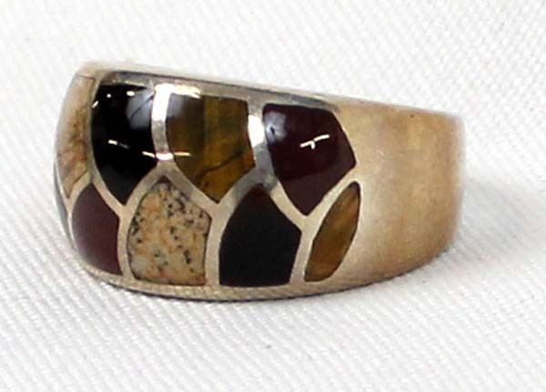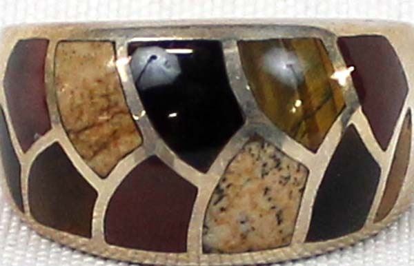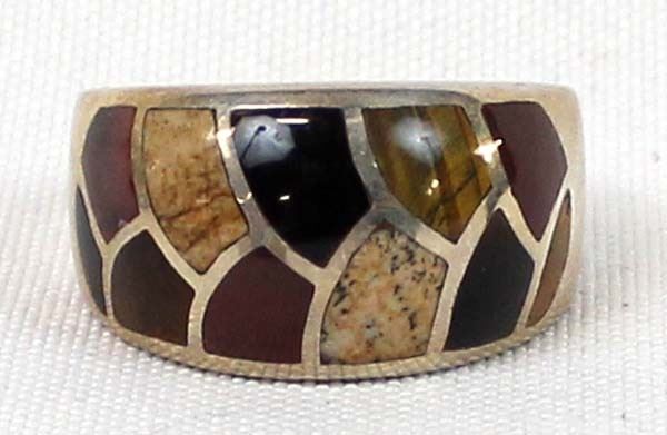 Sterling Inlay Ring, Size 11, stamped .925, includes pipestone, jasper, and onyx, measures .5''W