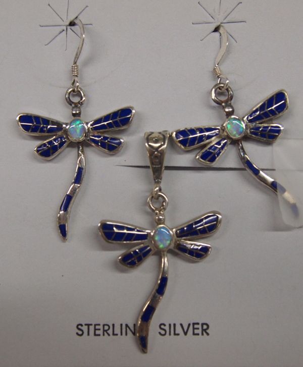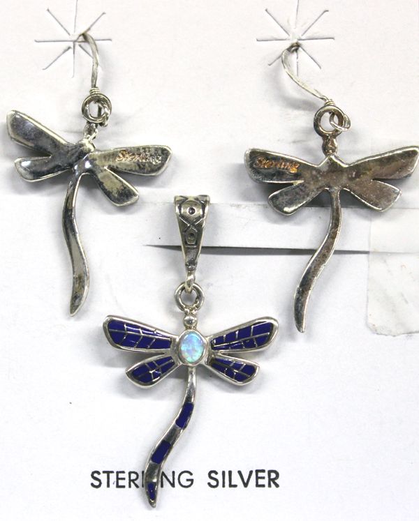 Sterling Lapis and Opal Inlay Dragonfly Earrings and Pendant, earrings measure 1.5''L x .75''W and pendant measures 1.5''L x .75''W