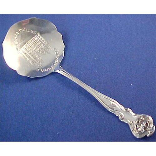 Sterling silver souvenir serving pieces are rare and highly collectible, and this one is a gem! It is a 5.5" long sterling silver bon bon spoon by Paye and Baker. The bowl has a well detailed embossed depiction of the Mormon Temple in Salt Lake City, Utah. The handle is a lovely Art Nouveau pond lily pattern. This spoon is in excellent unmonogrammed condition and will cost $4 to ship to US addresses.