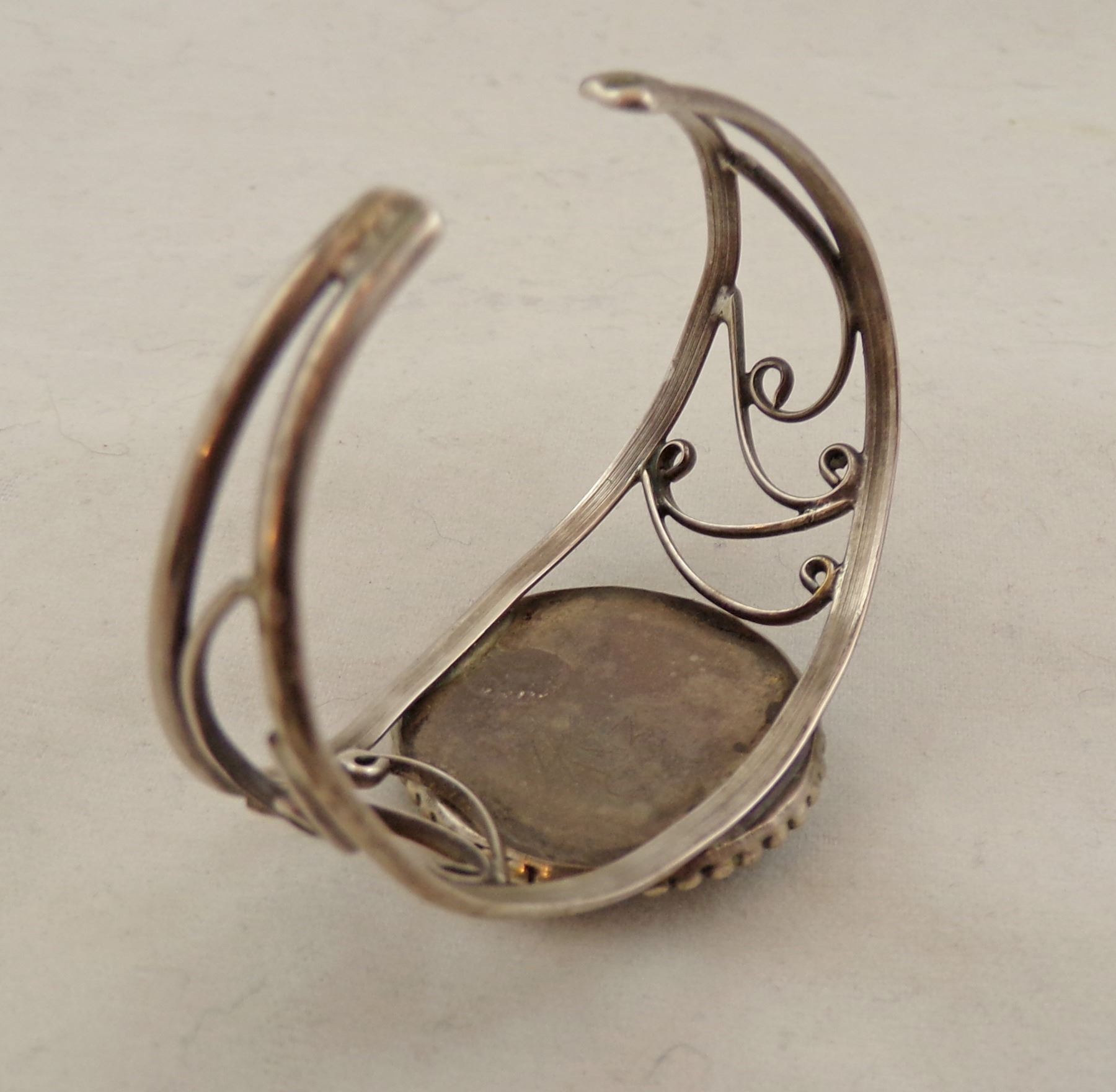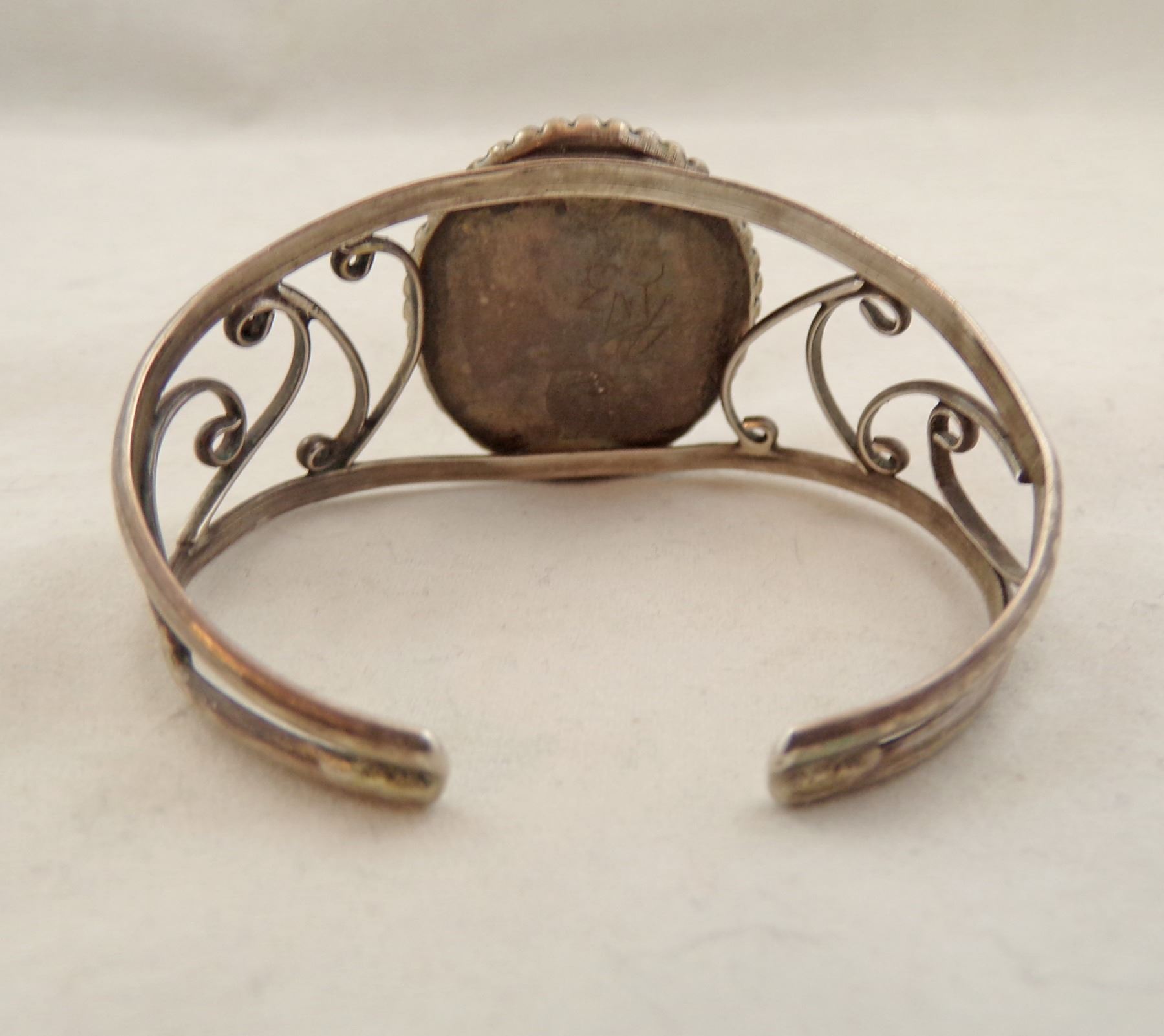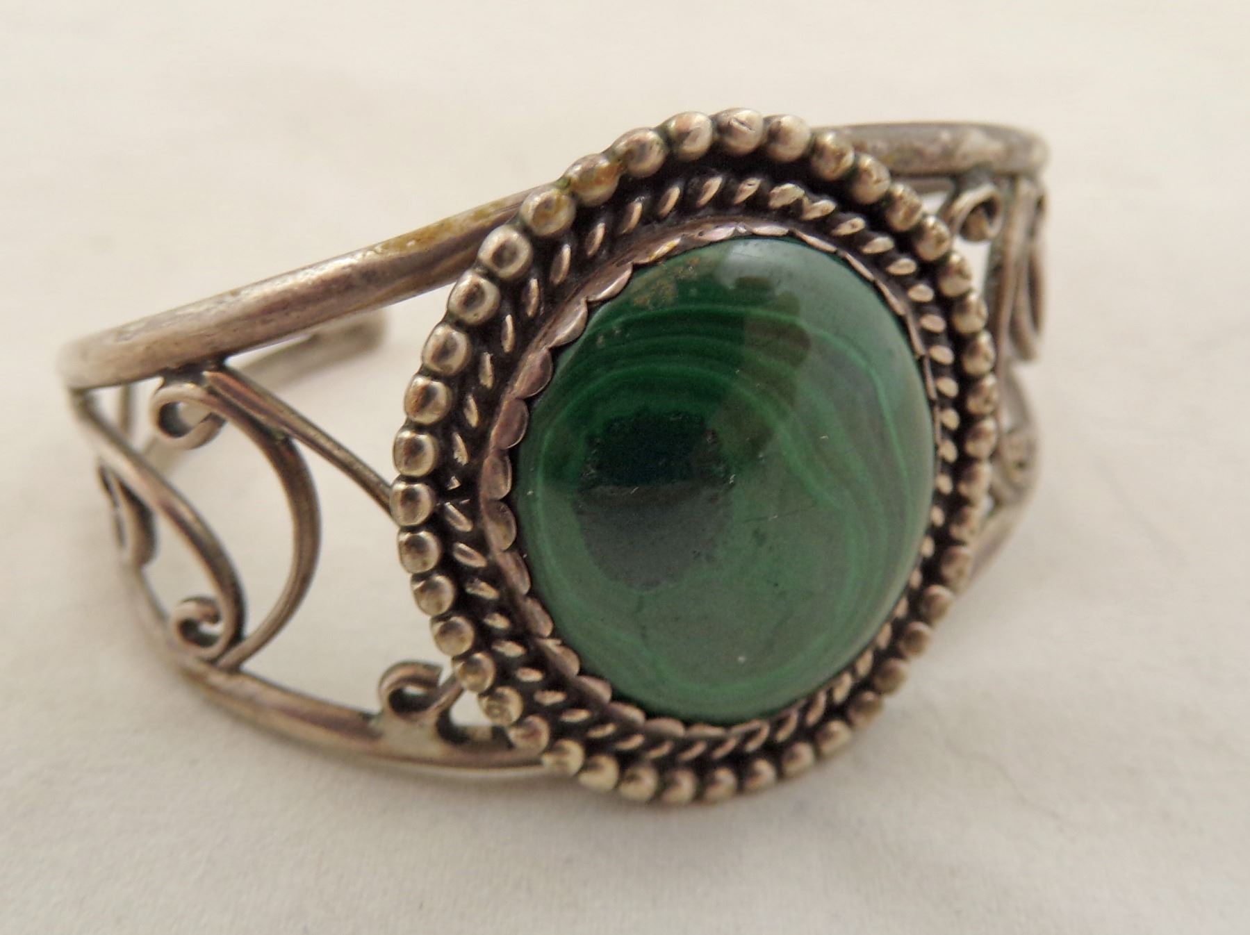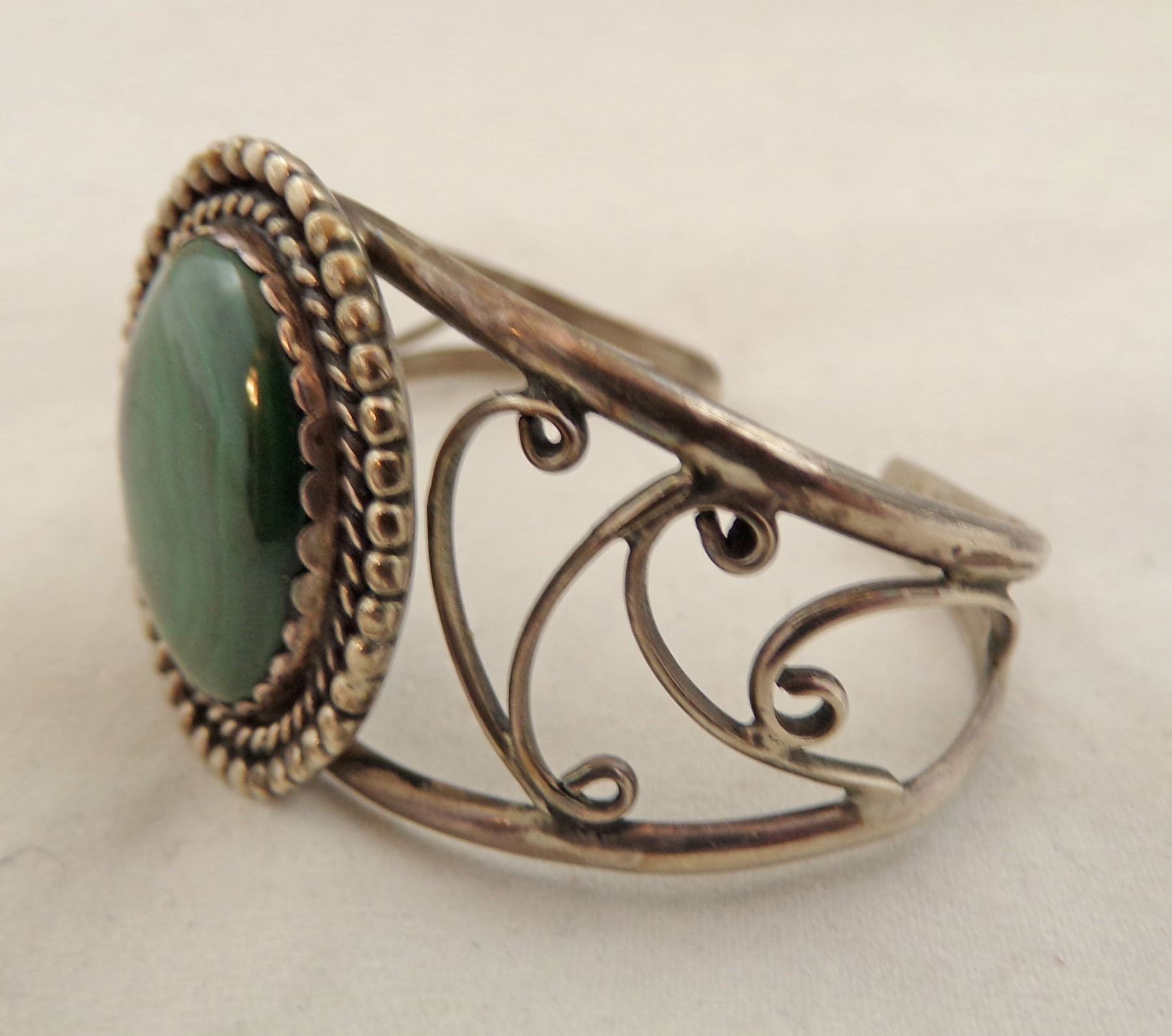 Sterling Malachite Cuff Bracelet by D. Katz, inside measures 5.5'' which includes the gap x 1.5''W, engraved signature on back
