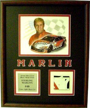 Sterling Marlin was the 1980-1982 Nashville Speedway USA Track Champion and 1994 & 1995 Daytona 500 winner. He was also the 1983 NASCAR Winston Cup Series Rookie of the Year. This is a Sterling Marlin race used sheet metal custom framed with photo. Actual piece of race used sheet metal framed with nameplate.