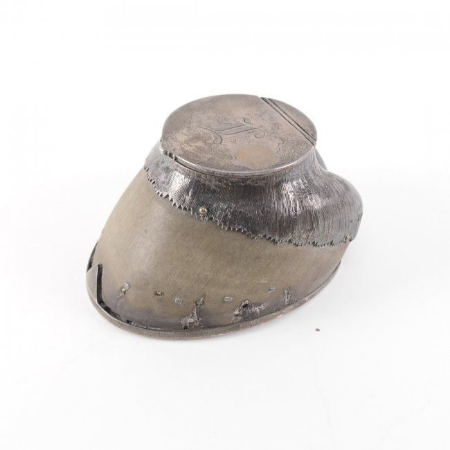 Sterling silver mounted horse hoof. Hallmarked: Robert Williams, London, 1902. Silver gilt trinket box interior. [5 1/2" x 4 1/4" x 2 3/4"]. In good condition.
