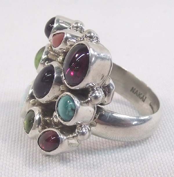 Sterling Multi Color Stone Ring - Nakai. Size 8, ring face measures approx. 7/8'' x 1''. Stones include: opal, turquoise, coral, amethyst, etc.