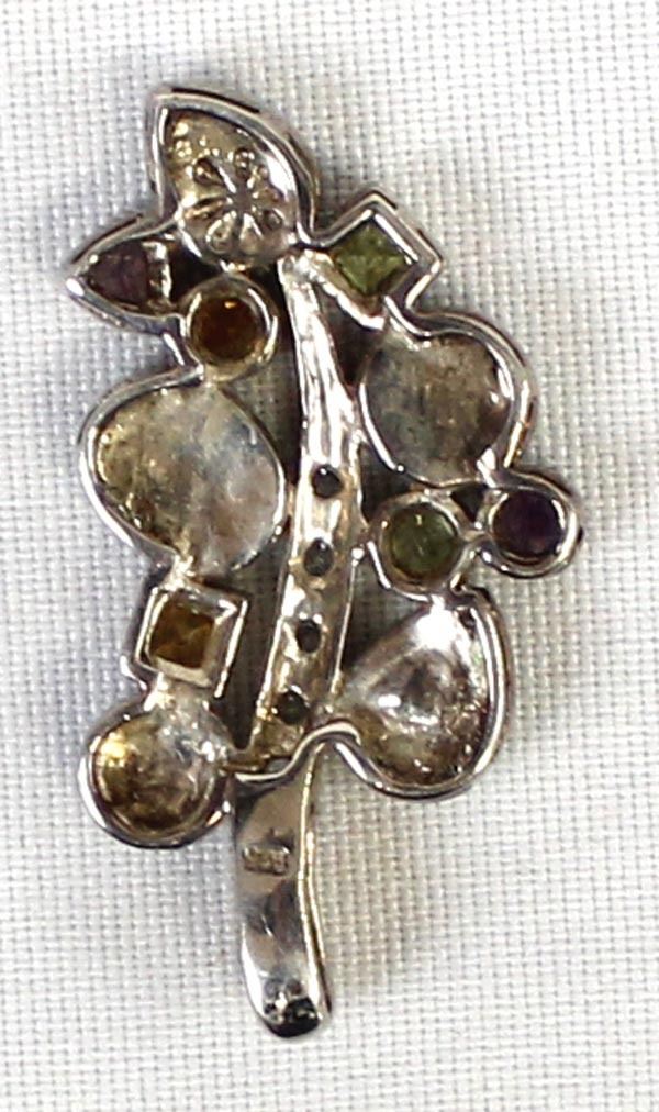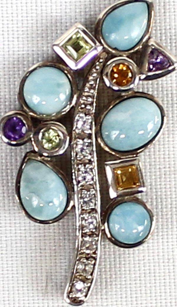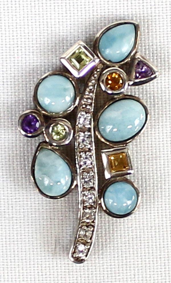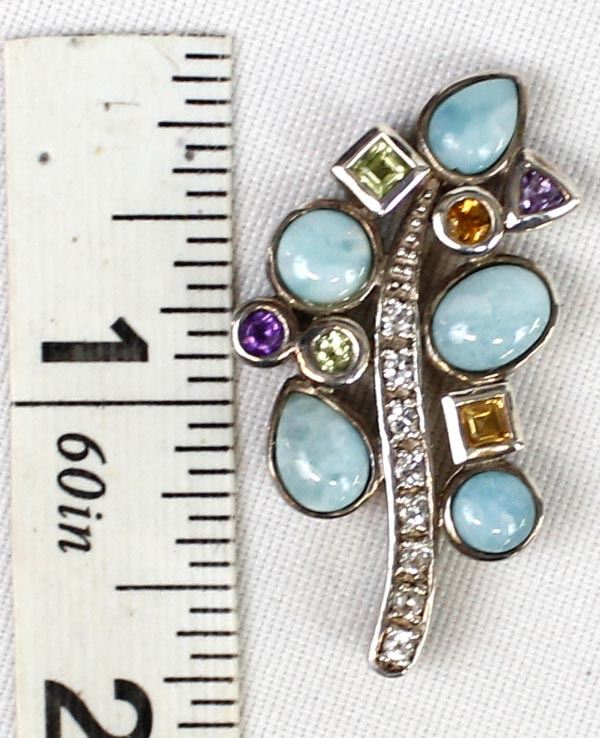 Sterling Multi-Stone Pendant, measures 2'' x .75'', includes marcasite, larimar, citrine, garnet, amethyst, and peridot, and rhinestone