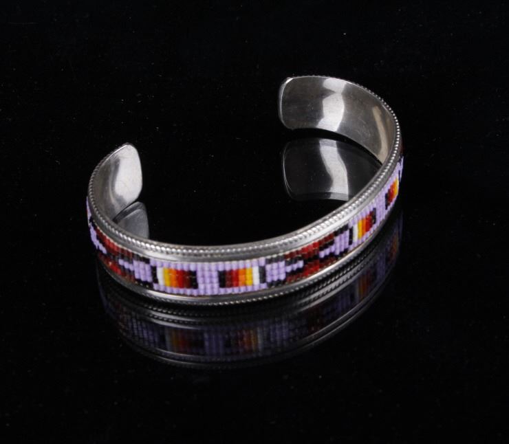 This lot features a sterling Navajo beaded bracelet.. the bracelet is marked sterling and signed by the original artist. The piece has a striking beaded pattern highlighted by the silver. The overall condition of the piece is good for its age. Measures: 5" C x 1" W