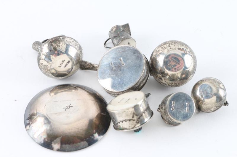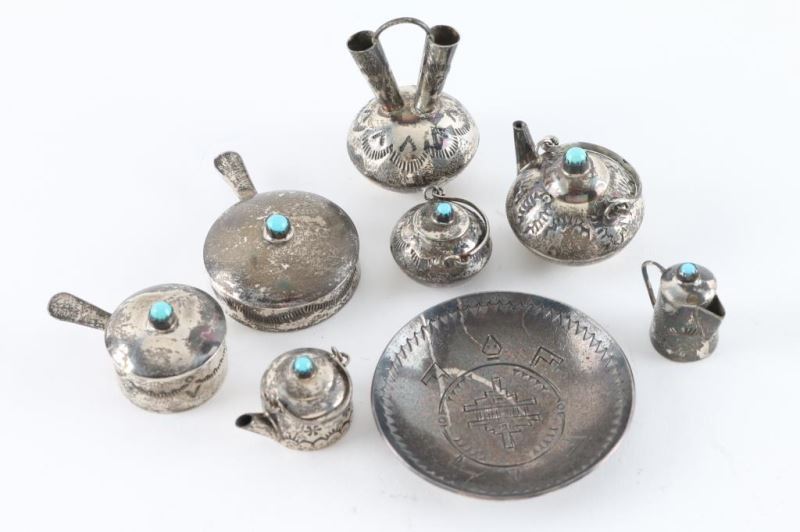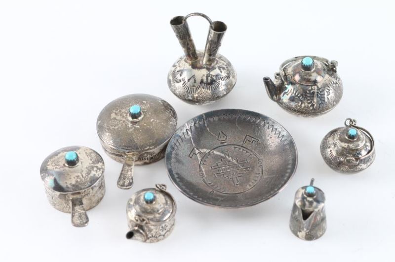 (7) Pieces total includes teapot, lidded pot, lidded pan, bigger lidded pot, smaller teapot, smaller coffee pot and a wedding vessel pot all sterling some accents with carving and turquoise maker marked "EMW". Also includes small flat dish appears sterling plated with a different maker mark two arrows into a circle.