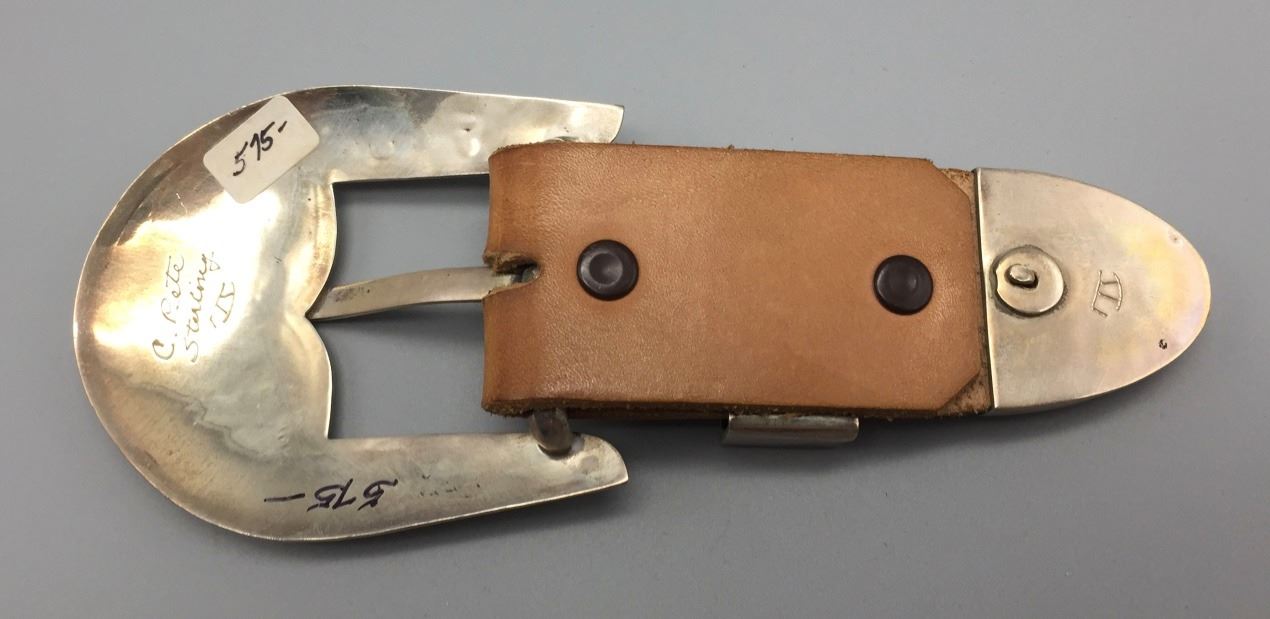 Maker: Curtis Pete, Navajo. Approx. Age: Circa 1970s. Size: Fits a belt up to 1.5” wide and weighs 103.8g (with the little leather piece). Condition: Good. NOS. Additional Info: Nice stamp work on a 3-piece set. Please look closely at the pictures - they are an important part of our description. Shipping: There will be a $5 handling / packaging fee for shipping this lot. The actual cost of postage will be added on top of that.