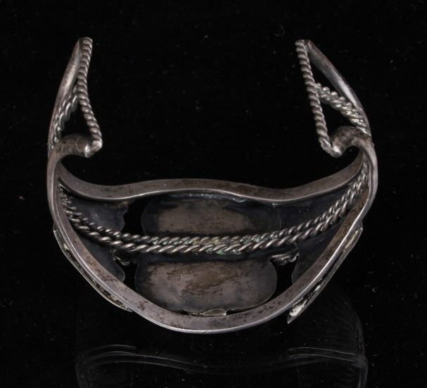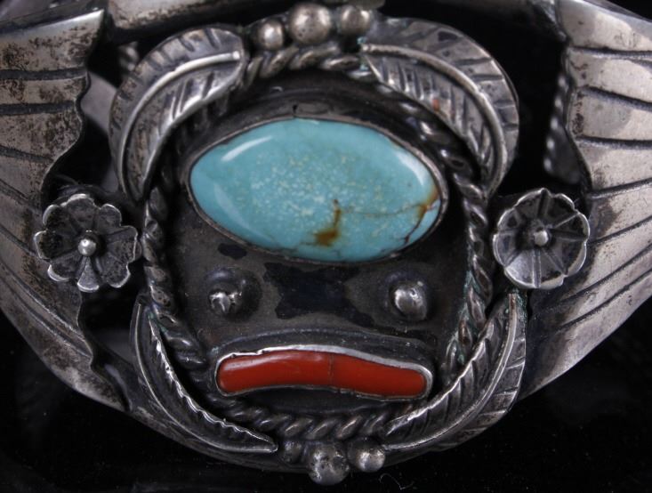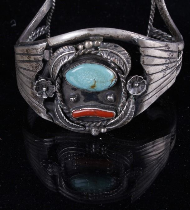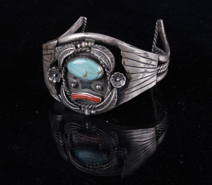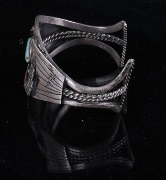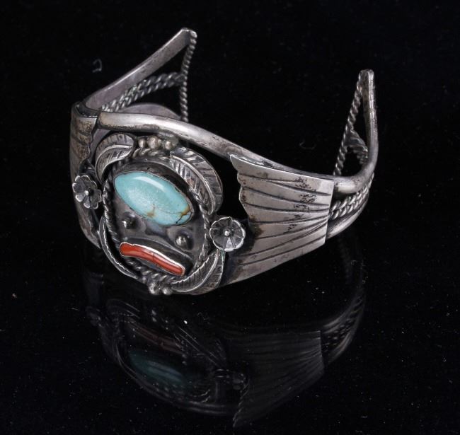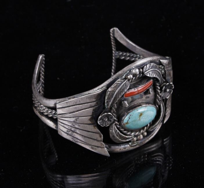 This lot features a sterling silver Navajo turquoise and coral bracelet. The bracelet has a stunning design centered around the two stones. Both stones have a good tone. The overall condition of the piece is good for its age. Measures: 5" C x 1 1/2" W