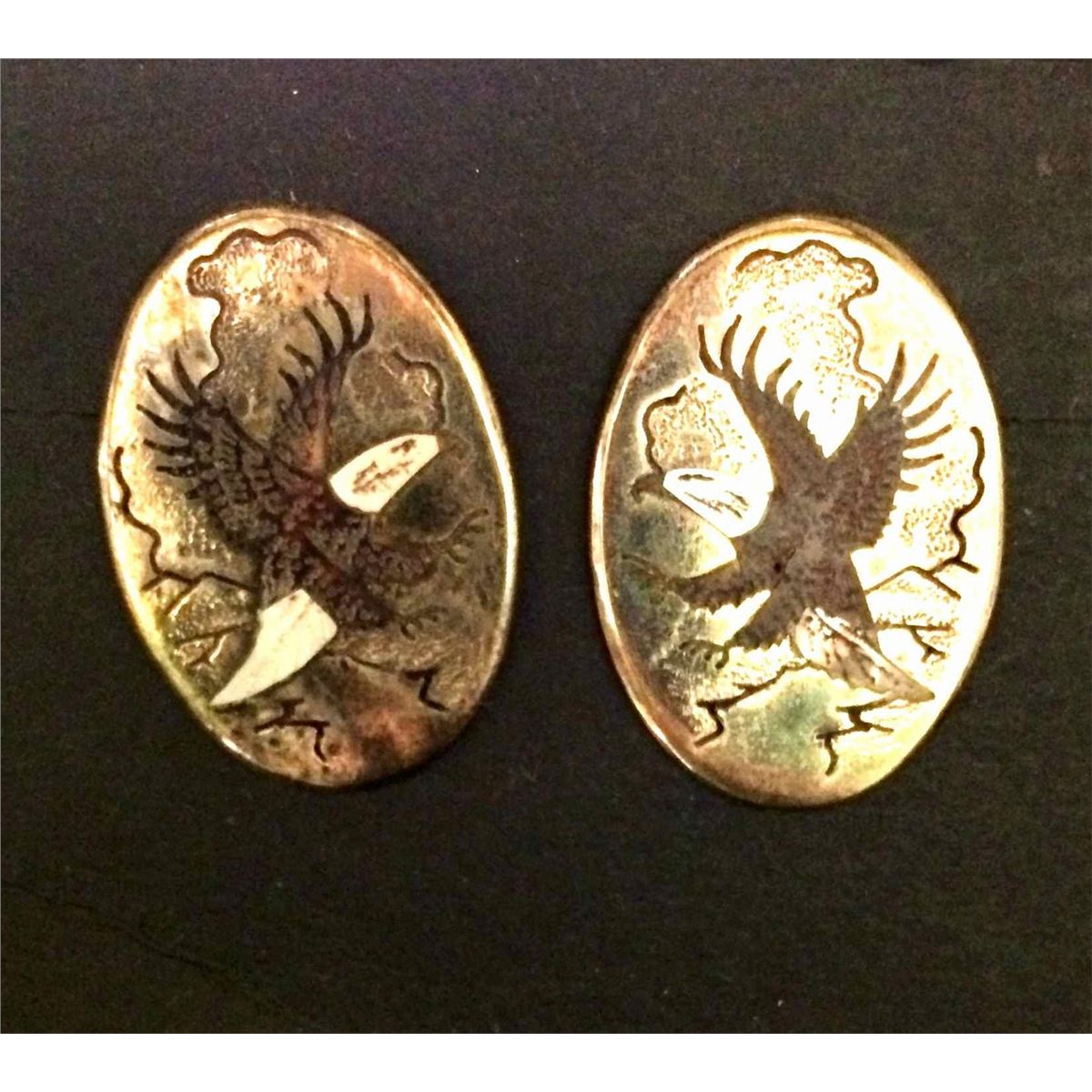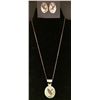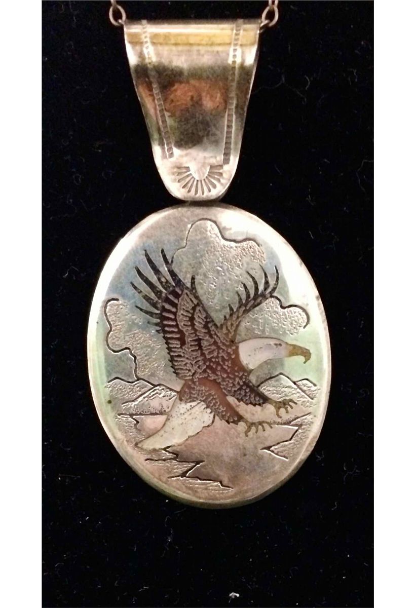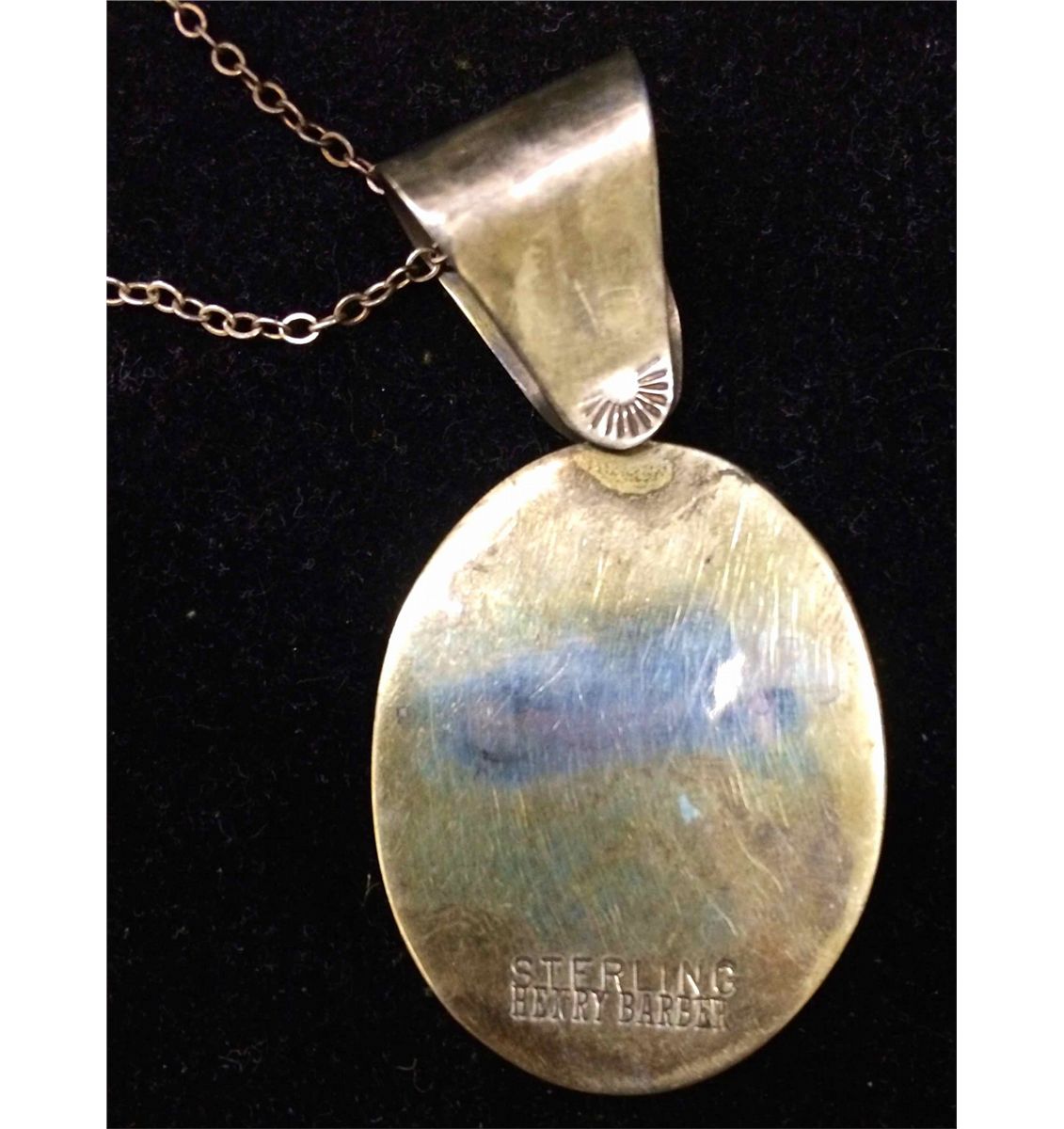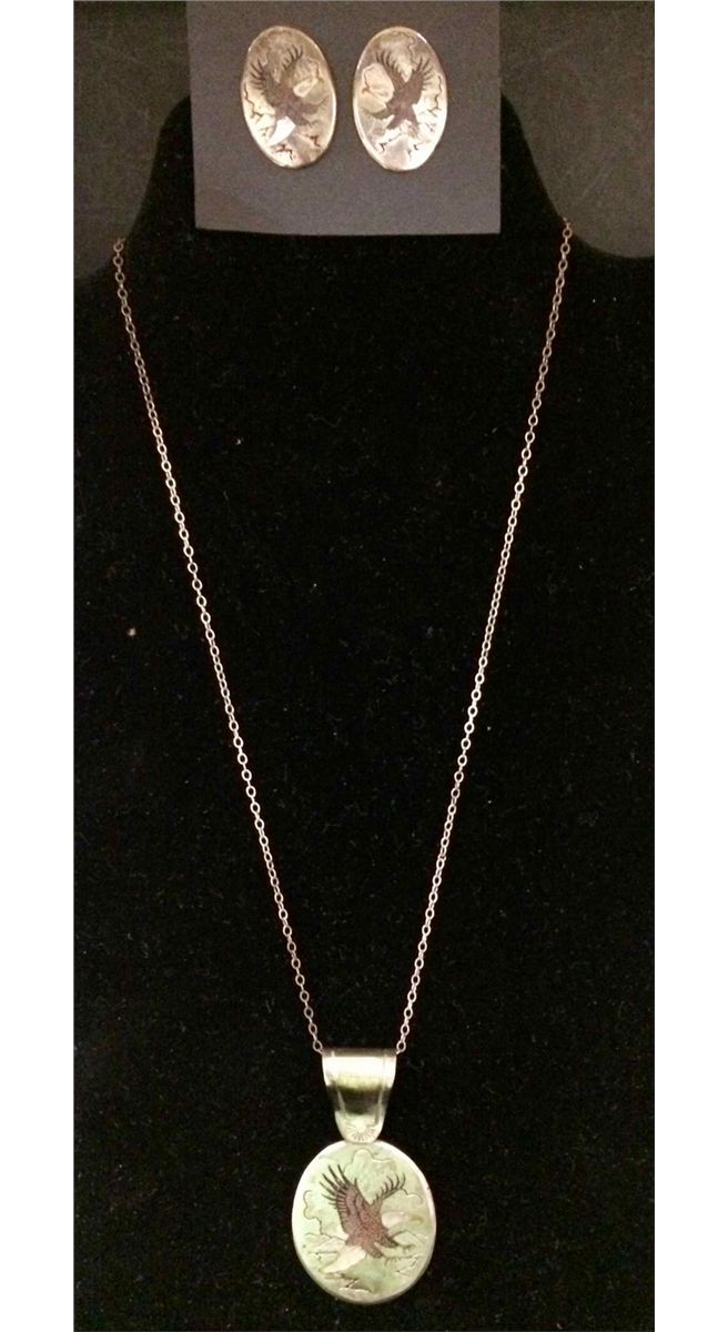 This necklace and earring set has beautiful inlay work depicting Eagles. It has a sterling 18” chain, is marked Henry Barber and Sterling on the reverse of the pendant, and weighs 19.9 g overall.