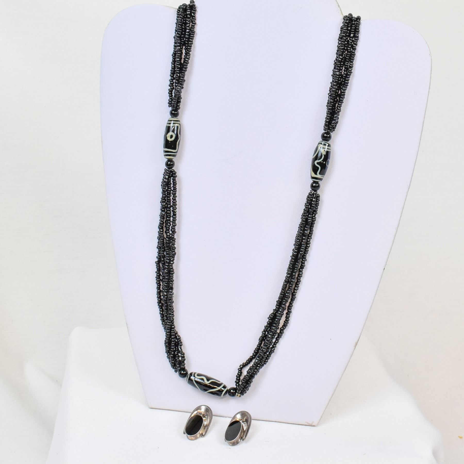 Sterling Onyx Earrings and Beaded Necklace, pierced post earrings measure 1.25''L x .5''W and are stamped .925 and hallmarked NF, the Tibetan Dzi Drum Barrel Bead Necklace measures 20''L end to end