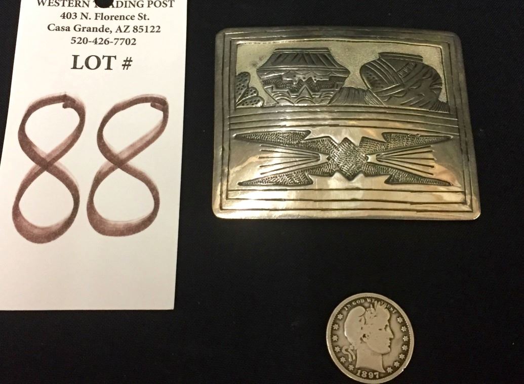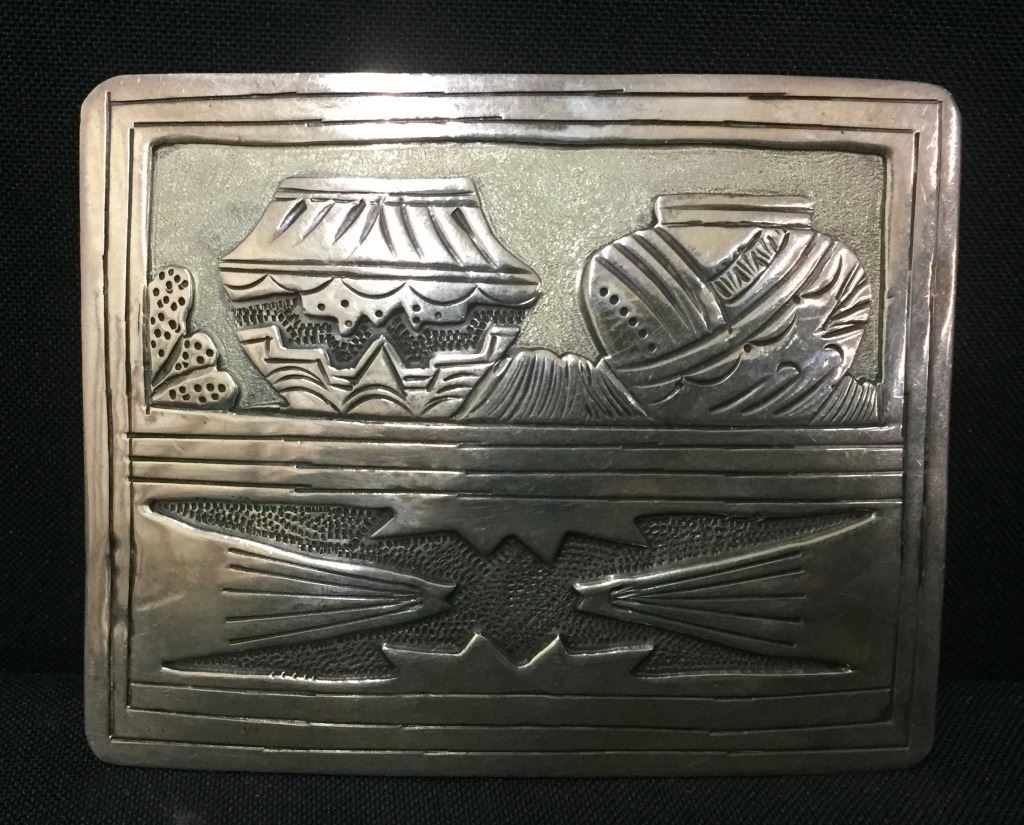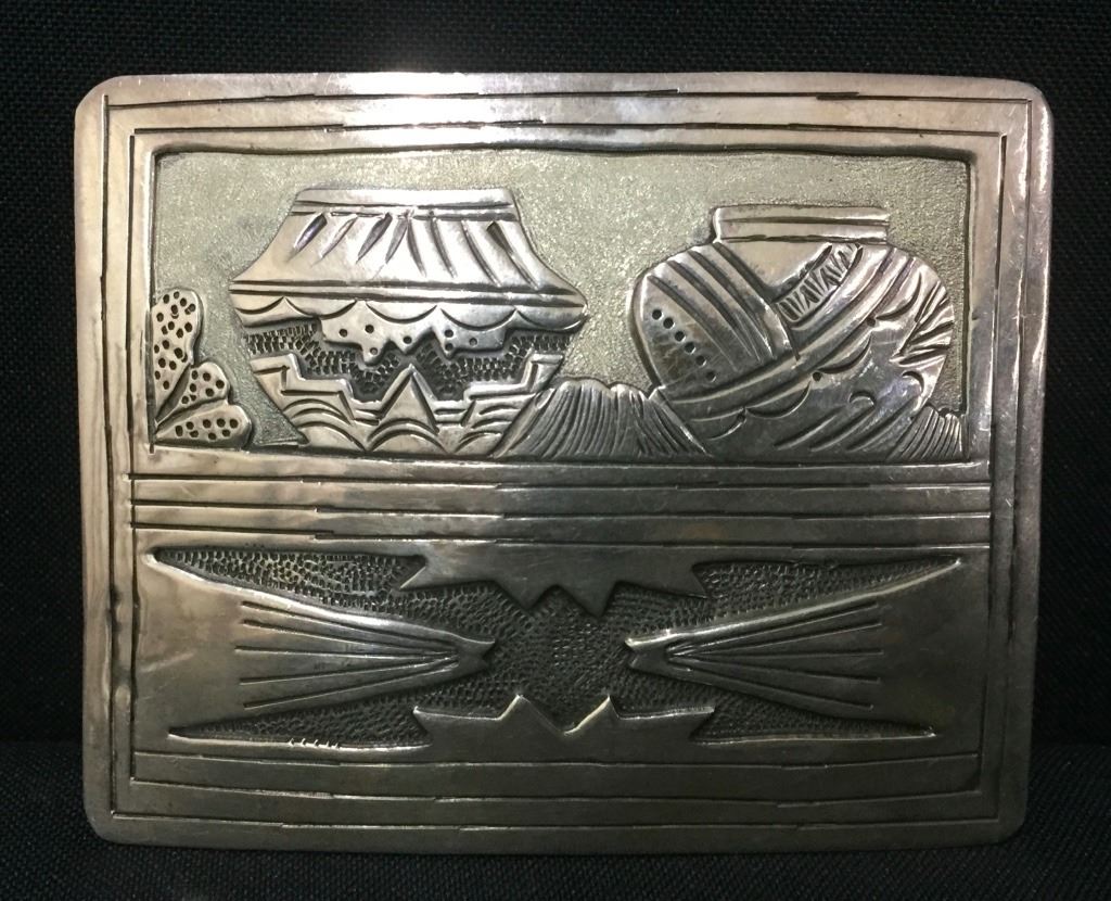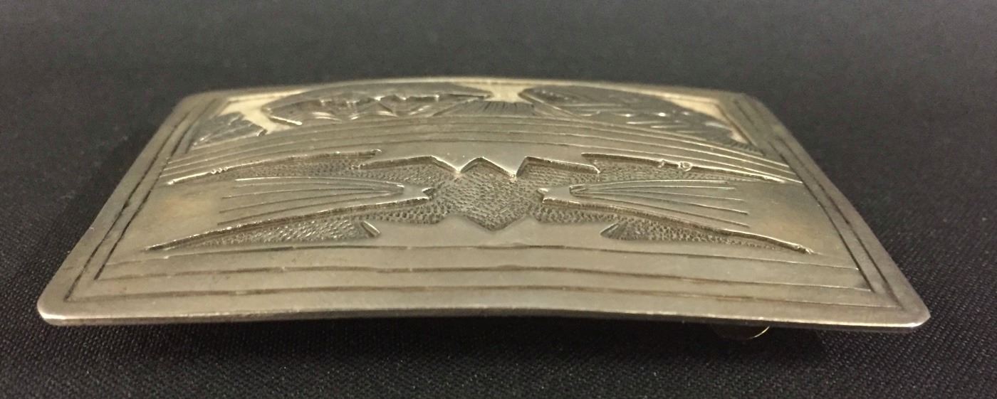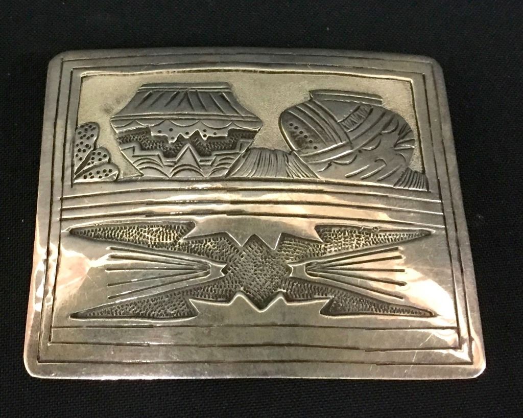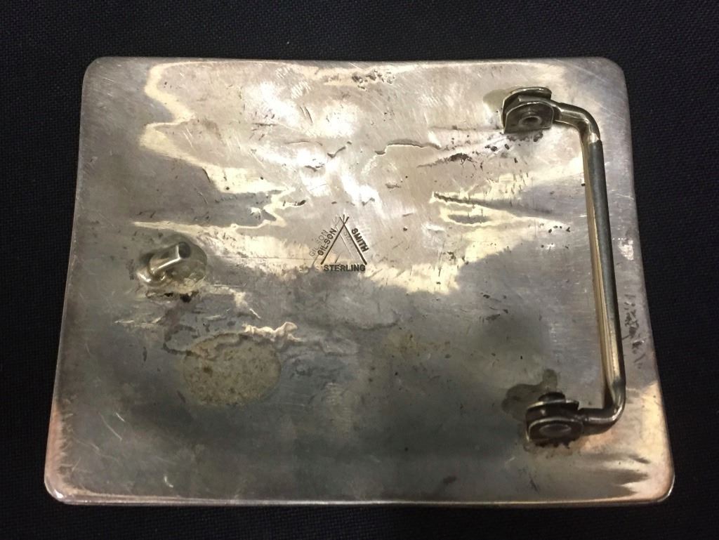 Maker: Hallmarked, Gilson Smith and Sterling with a Teepee. Approx. Age: Fairly modern. Size: Measures 3” wide X 2.5” tall and fits a belt up to 1.5” wide. Weighs 51.2g. Condition: Good. Additional Info: Marked as sterling. Please look closely at the pictures - they are an important part of our description. Shipping: There will be a $5 handling / packaging fee for shipping this lot. The actual cost of postage will be added on top of that.