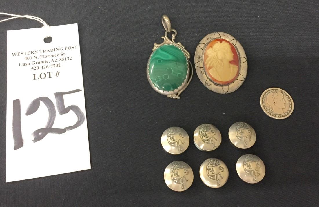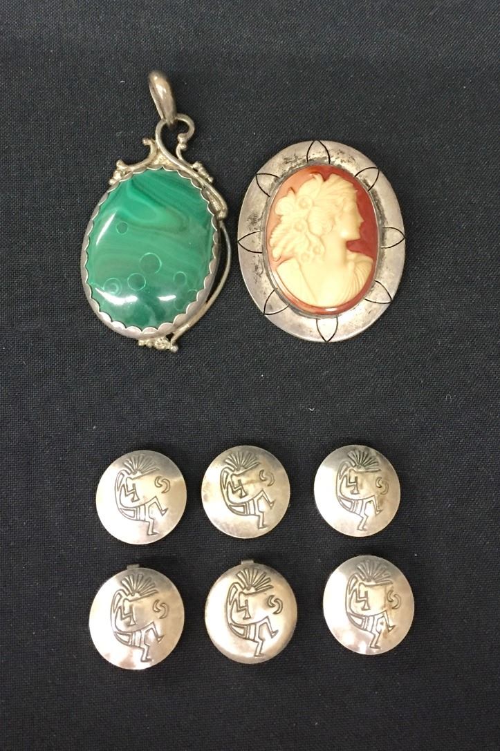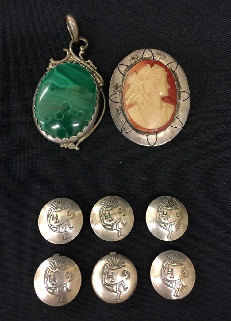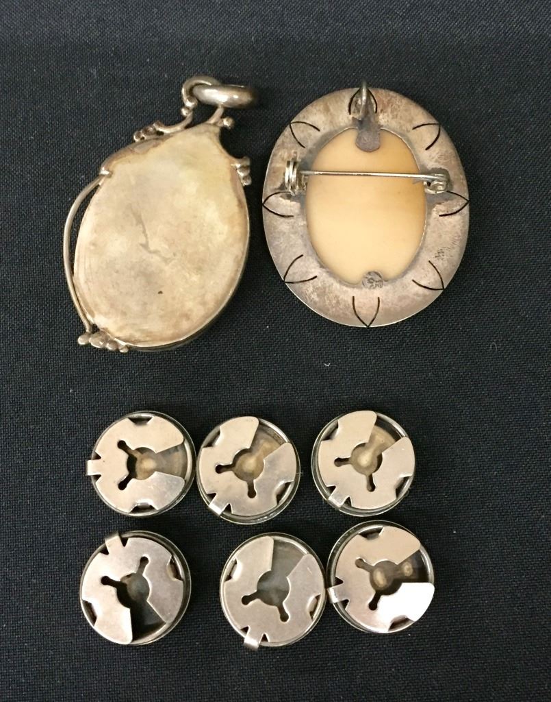 Two Sterling pendants and six button covers included. Collectively they weigh 64.1 g. Please look closely at pics - they are an important part of our description. Shipping: There will be a $5 handling / packaging fee for shipping this lot. The actual cost of postage will be added on top of that.