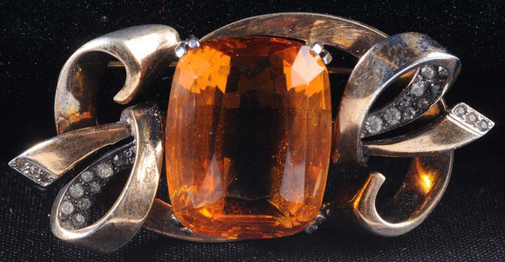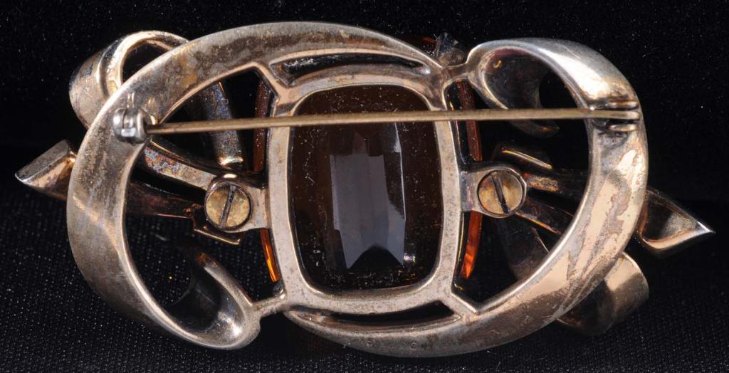 Description Gold wash over sterling with large 1.25-inch center amber stone with rhinestones on bow. Some gold wash darkening and darkened smaller stones. Condition (Very Good). Size 2 - 1/2" x 1 - 1/3".