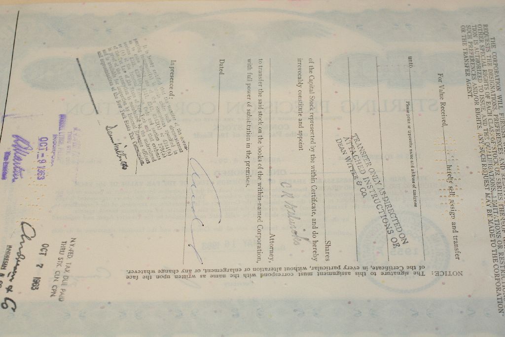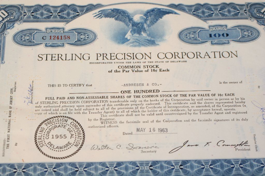 Sterling Precision Corp. Stock Certificate Dated 1963
