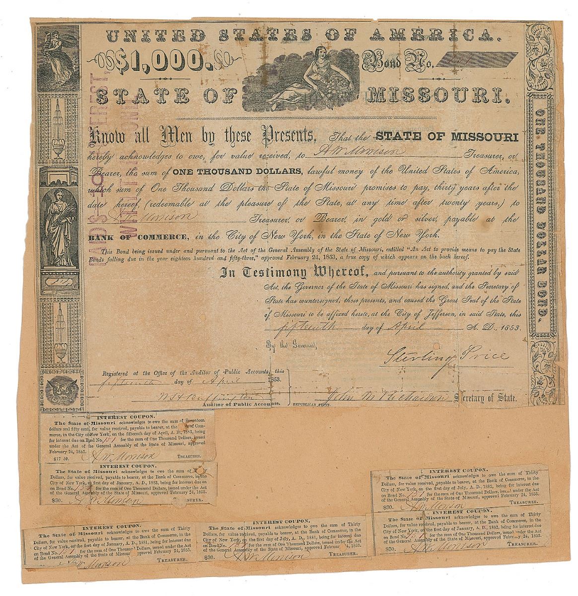 Military officer (1809–1867) who served as an American general during the Mexican-American War and as a Confederate general during the Civil War. Engraved DS, one page, 11 x 9.5, April 15, 1853. A promissory note for $1,000 issued by the State of Missouri. The certificate and several of the original interest coupons are affixed to a 12.5 x 18 album page. In good to very good condition, with trimming and mounting as noted, punch hole just touching one letter of first name, scattered wrinkling and toning, and tearing and chipping to album page.