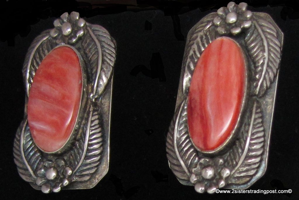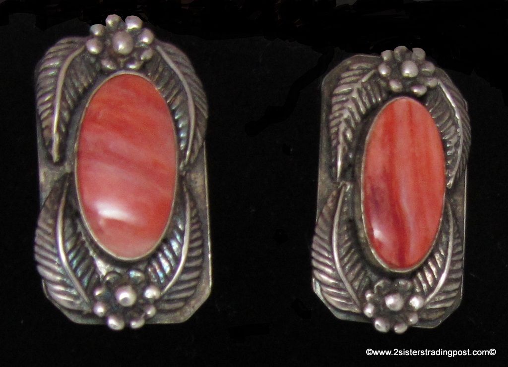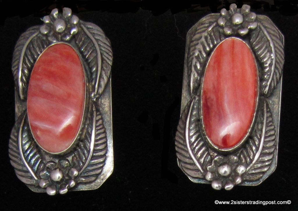 Navajo style rectangle shape earrings with an oval spiny oyster shell in the center, surrounded by a feather design. Earrings measure approximately 24 mm x 12.8 mm the spiny oyster shell in the center measures approximately 14.6 x 7.5. Earring weighs approximately 3.5 g for total combined weight of 7 g. Earrings or stamped sterling, but not hallmarked.