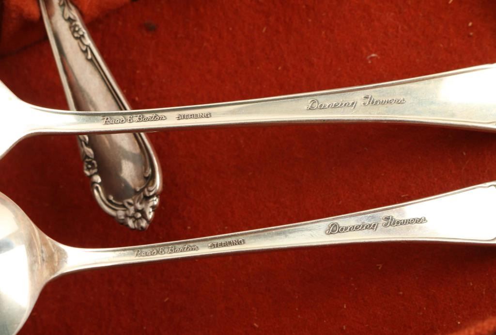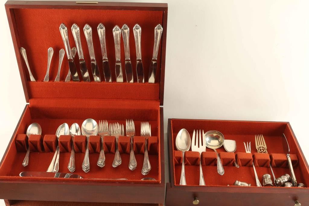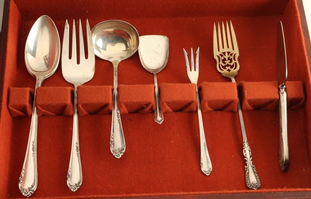 8 piece set, Dancing Flowers pattern, includes original receipt for 14,577.00 from 1980's. Includes 8 dinner knives, 8 dinner forks, 8 salad forks, 9 teaspoons, 6 soup spoons, 6 butter servers, 1 cake server, 1 cheese server, 1 pickle fork, 1 nut shovel, 1 meat forks, 6 salt pepper shakers. All in wooden storage case.