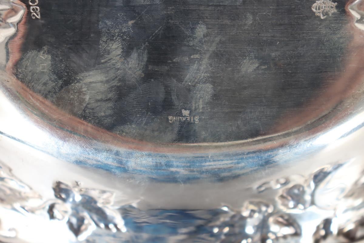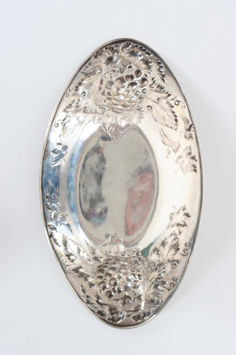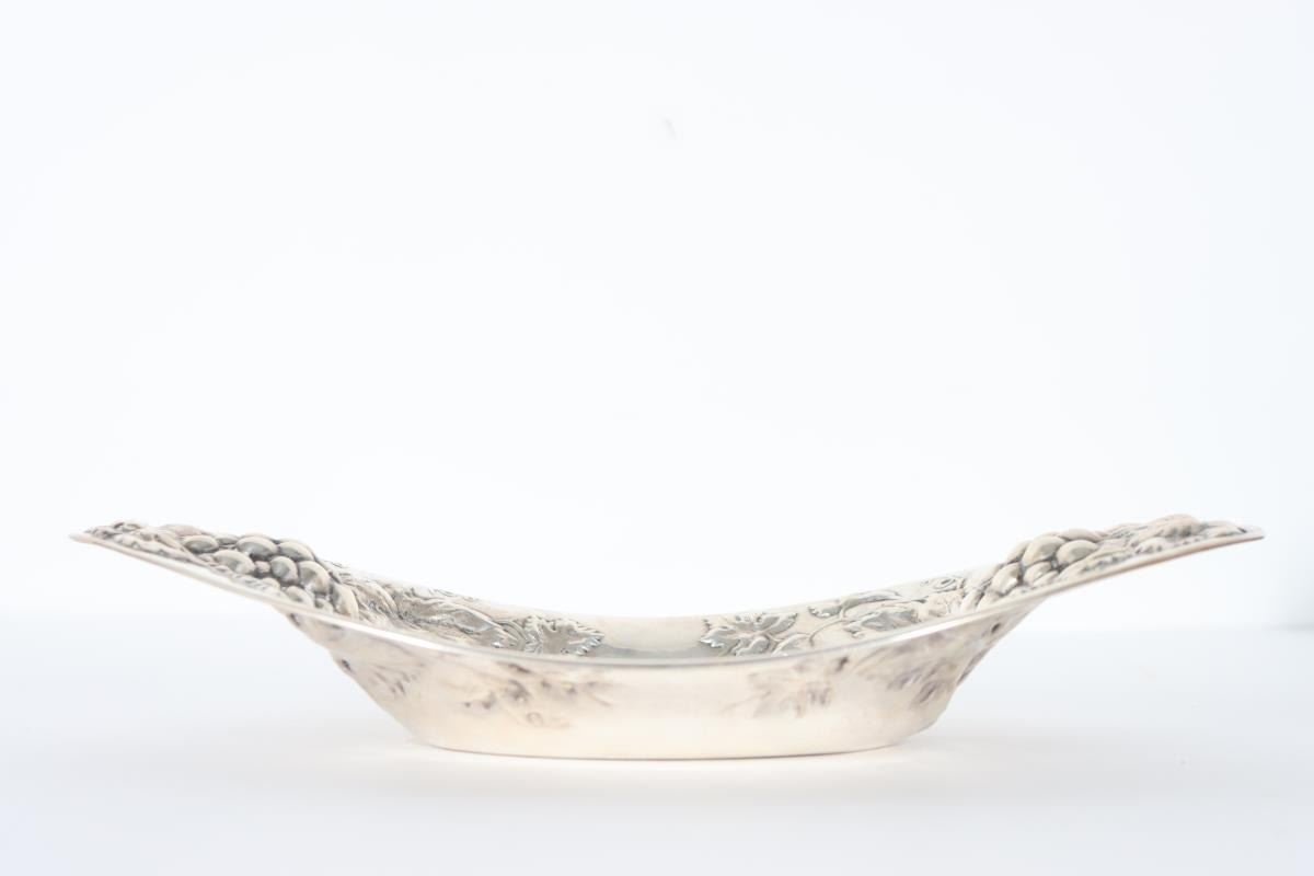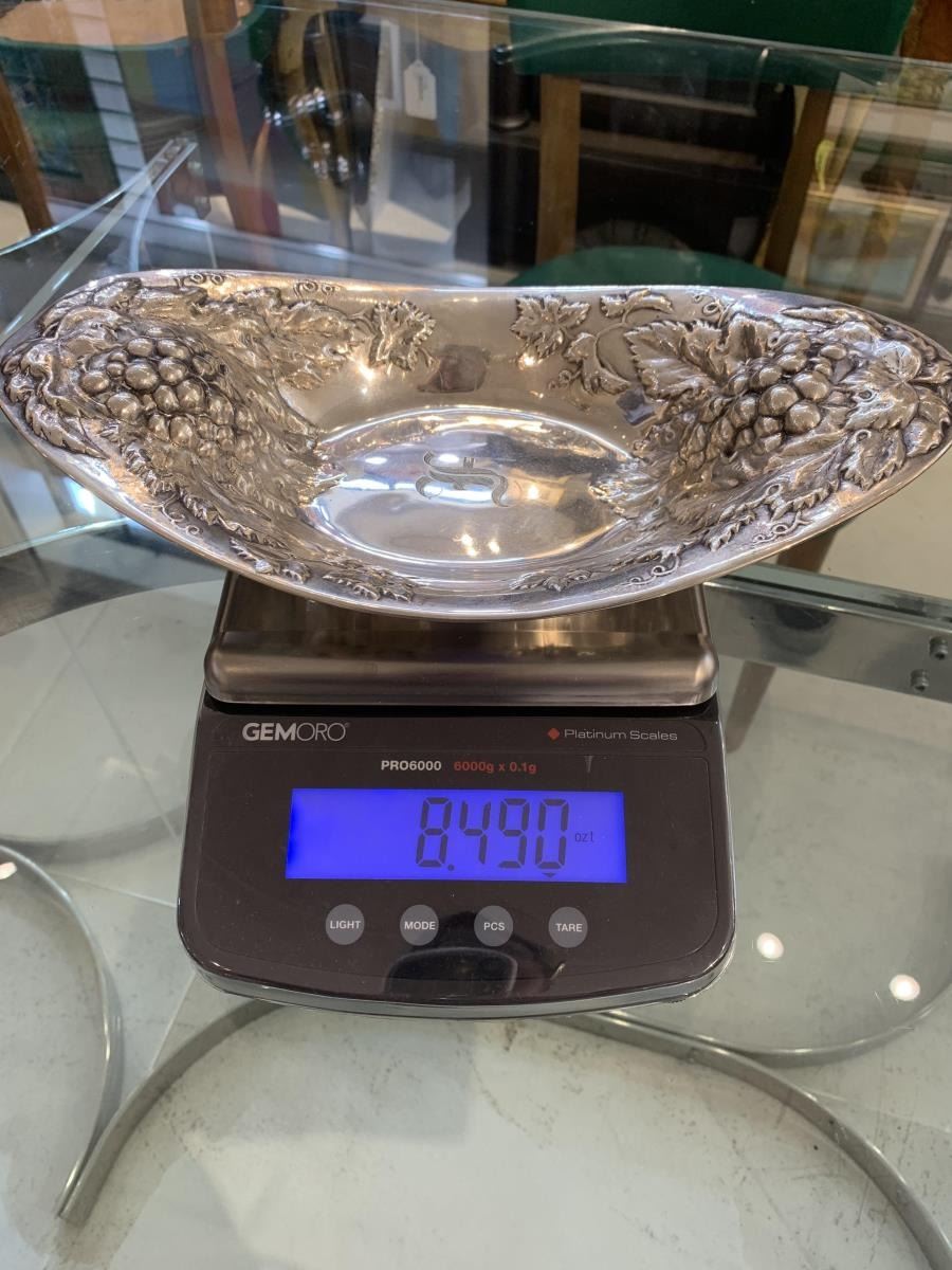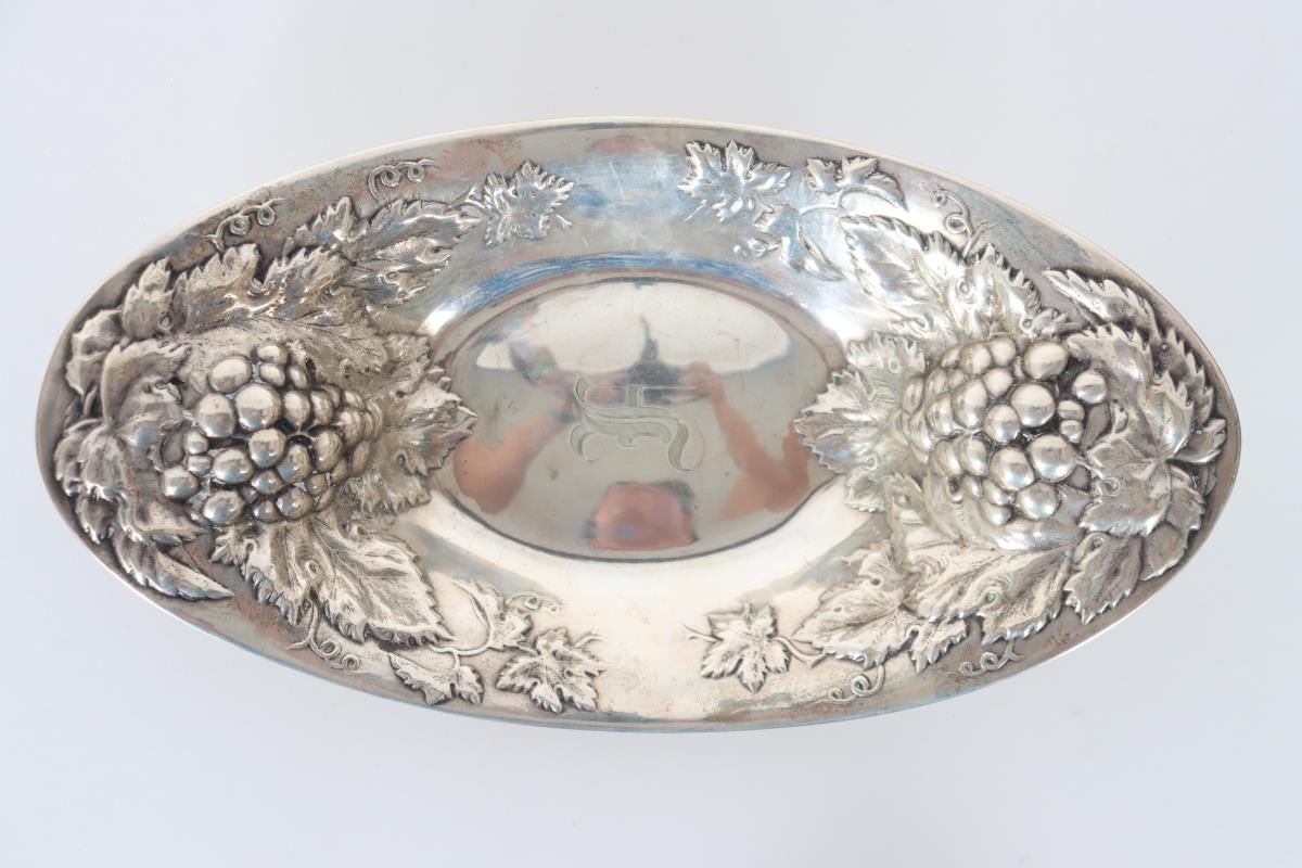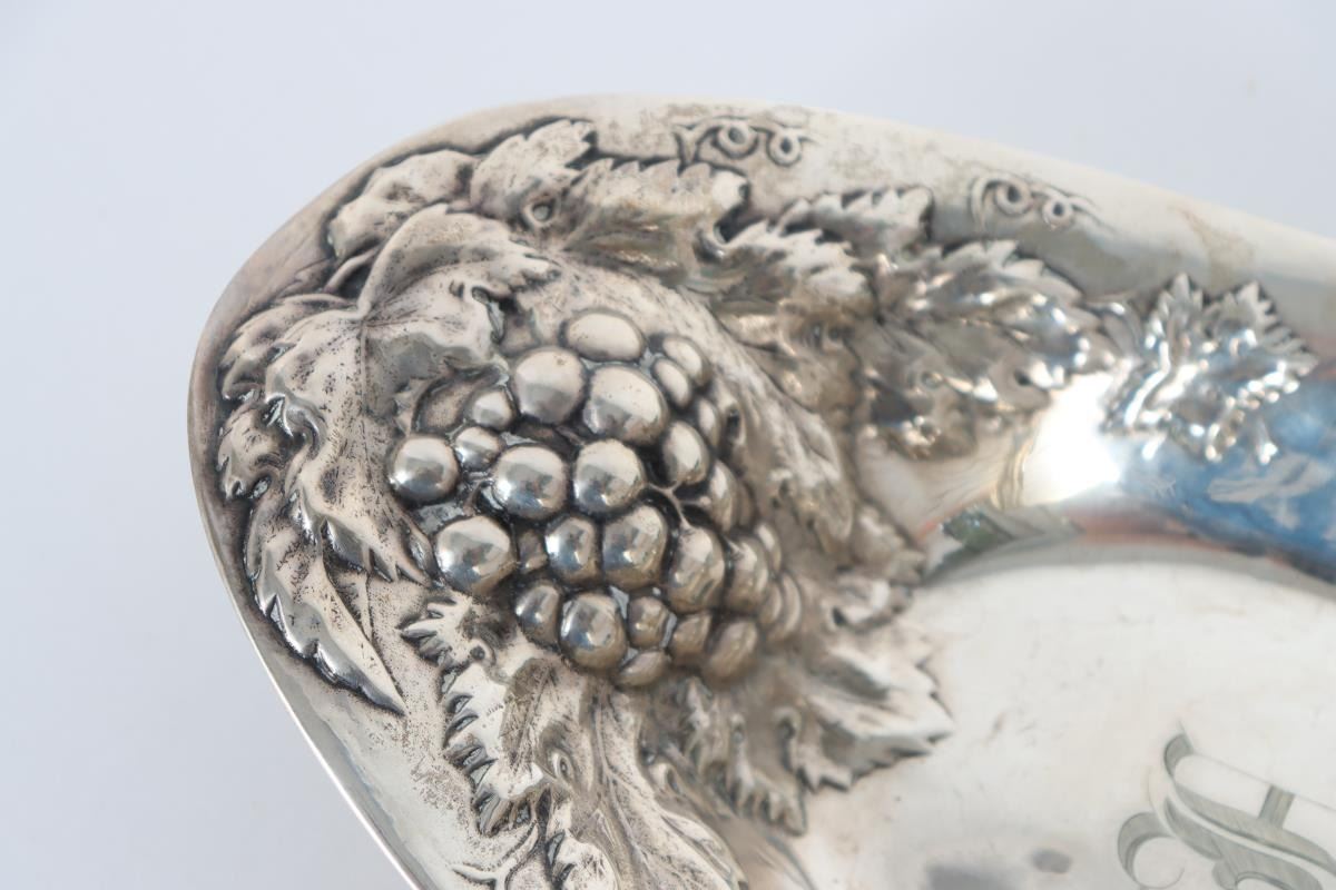 Silver repousee basket with grape and leaf design, monogrammed in center, marked sterling on bottom.