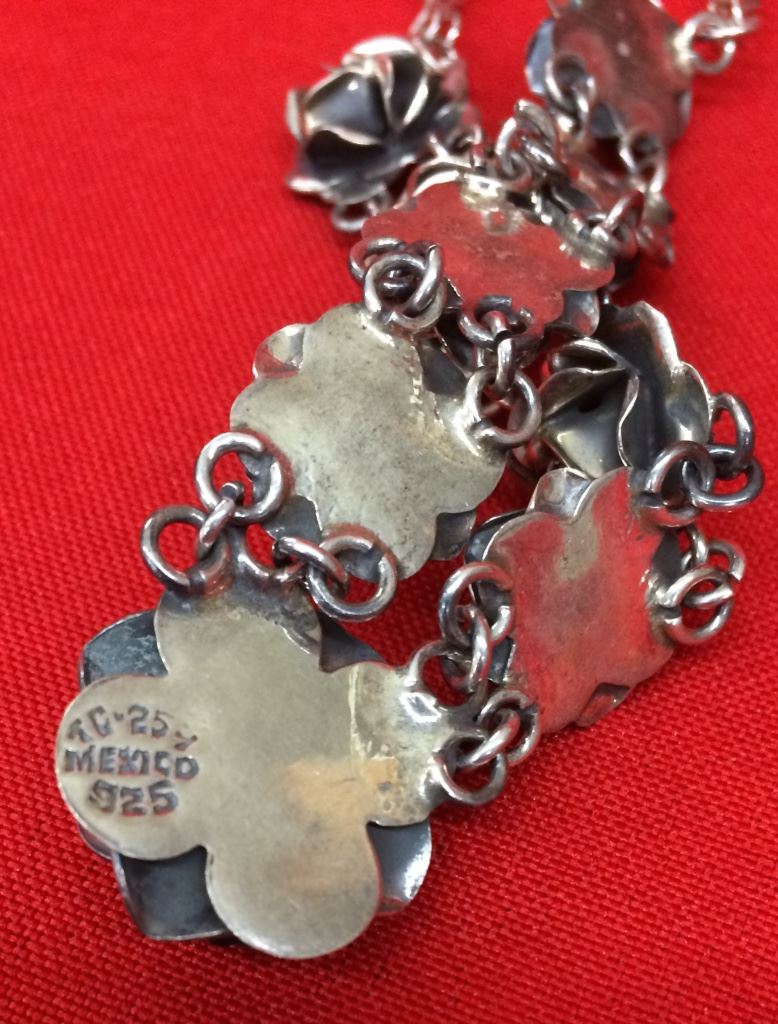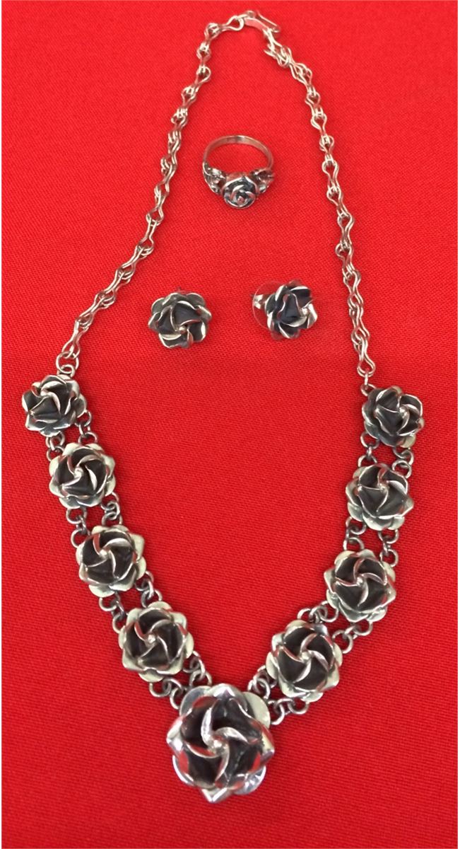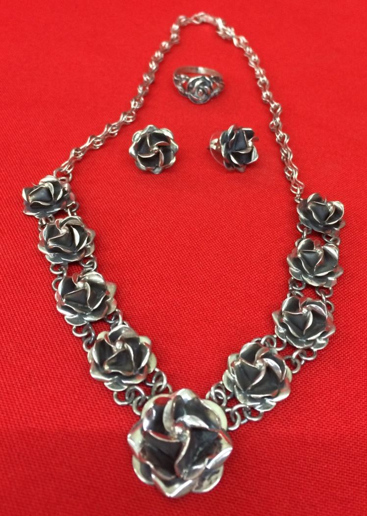 There is a matching pair of earrings, a ring (size 6.5) and a necklace, which fits approx. 16” around the neck, all for one money in this lot! This beautiful hand-made set features sterling roses and comes from Taxco, Mexico (hallmarked from a silversmith there). The set weighs about 50g.