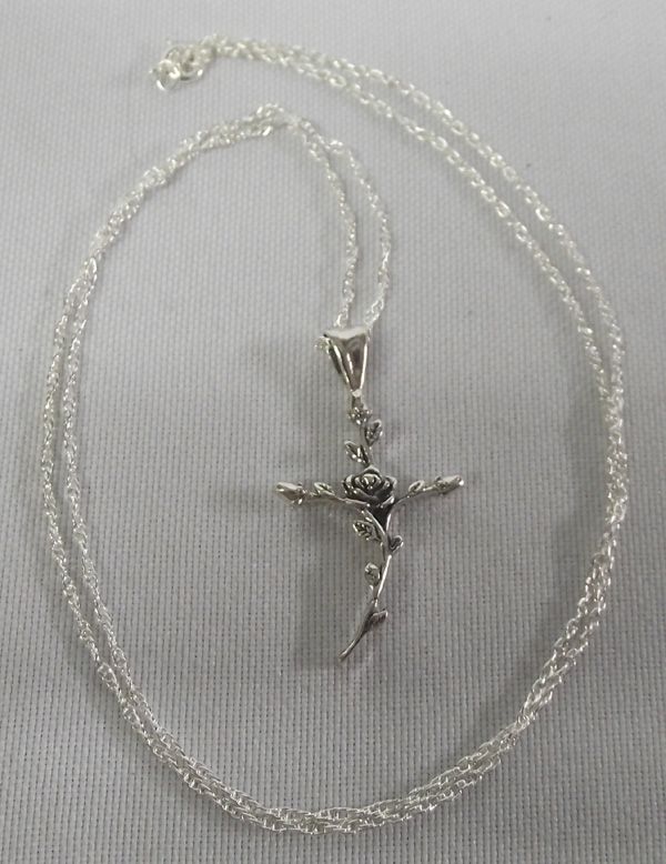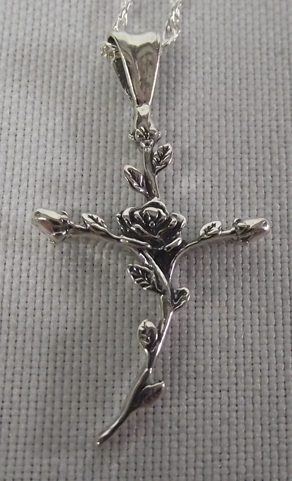 Sterling Rose on Vine Cross Necklace. Cross is 1.25''L x .75''W. The chain is 22''L and stamped. Really a pretty piece.