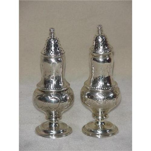 A very large pair of sterling silver salt and pepper shakers, 6 1/2" tall, handmade and chased, the tops pull out of the shakers. They are both engraved with initials as shown. The shakers have no maker marks or silver marks but they do acid test as sterling. They are a beautiful pair and it is hard to understand why they have no marks. They're condition is very good and they polish beautifully, they will make a great addition to your table setting.
