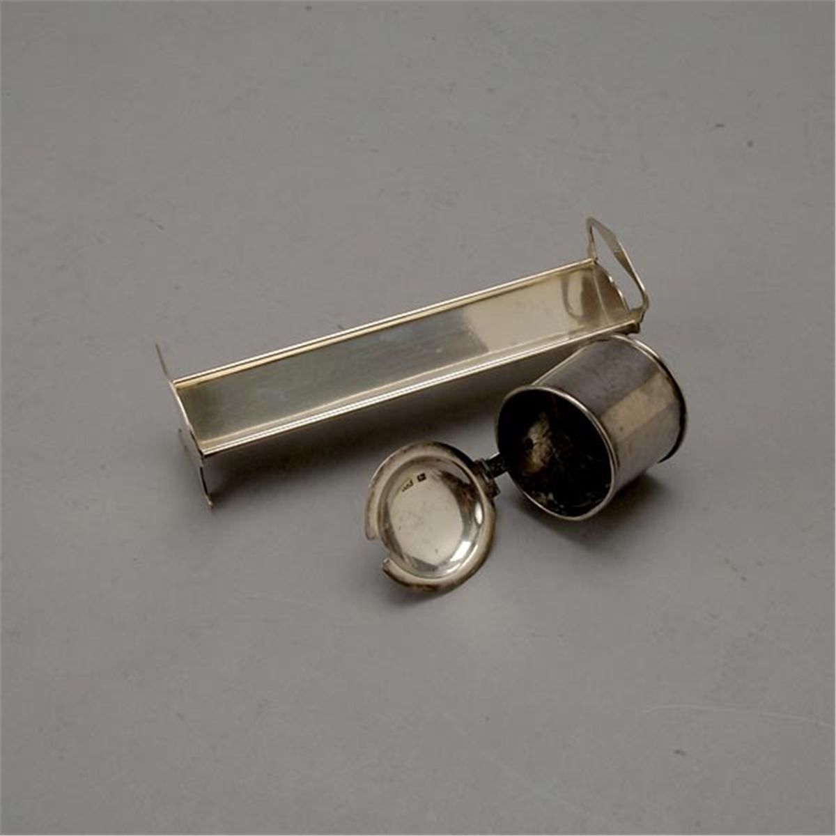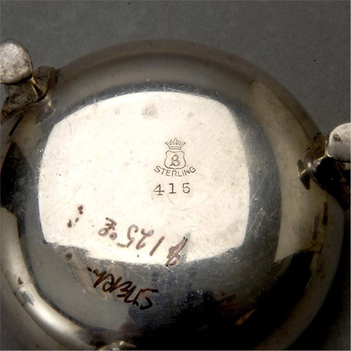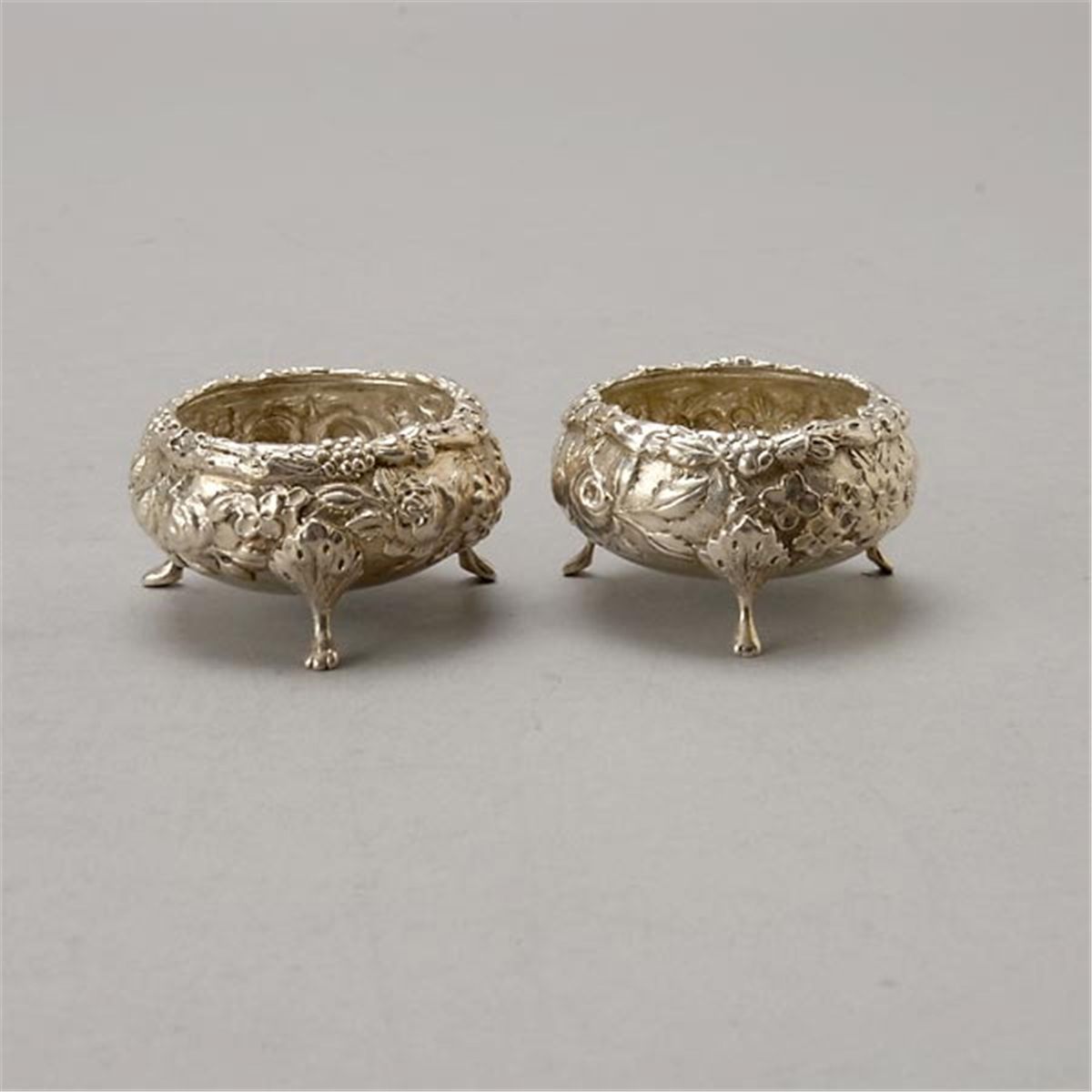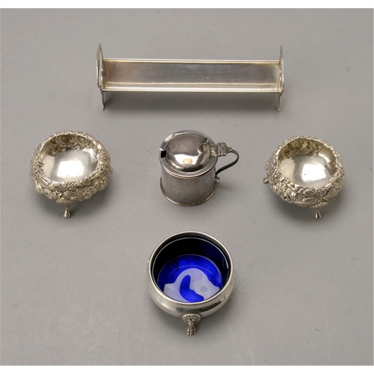 Sterling Group: a pair of Schultz Baltimore repousse salts; another salt with glass insert; a mustard; and a stand (5) {Total silver weight 9.11 troy oz; length of stand 6 inches}