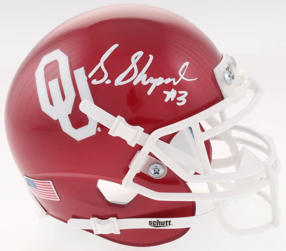 Schutt Oklahoma Sooners mini helmet has been hand-signed in white paint pen by Sterling Shepard.