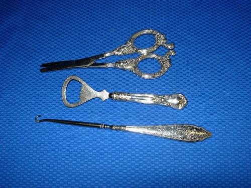 Sterling Shoe Hook measure 7 3/4" l., Sterling Bottle Opener, measures 5 1/2" l., Silverplated Grape Shears measures 6 1/2"