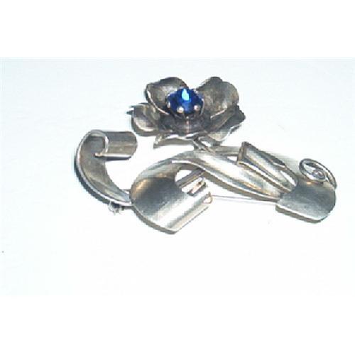 This beautiful, signed, "Sterling", Brooch is designed as a wonderful flower, featuring a 1/2 inch glass, Royal Blue, faceted, glass, rhinestone. Dogtooth setting. Sterling Silver forms the leaves and petals. (One of a kind). Measures: 2 1/2 inches long by 2 inches tall. Vintage pin on the back and signed, STERLING. Mint Condition.
