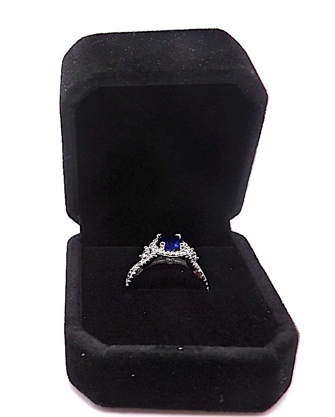 The 6.0mm Lab-Grown Blue Sapphire is Mounted in 925 Stamped Solid Sterling Silver with White Gold Overlay, which gives the Ring its High Polish and Shine.