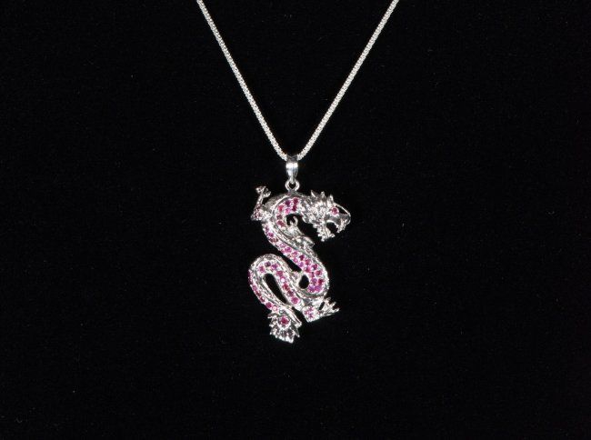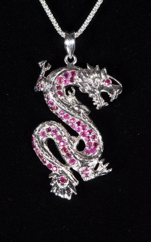 One large dragon style ruby pendant; matching open link chain, both of which are sterling silver; pendant is set with fifty three round natural rubies; MI clarity; suggested retail replacement value: $800; accompanied with Certificate; H: 4.5 cm, W: 3 cm (dragon pendant), 13 grams
