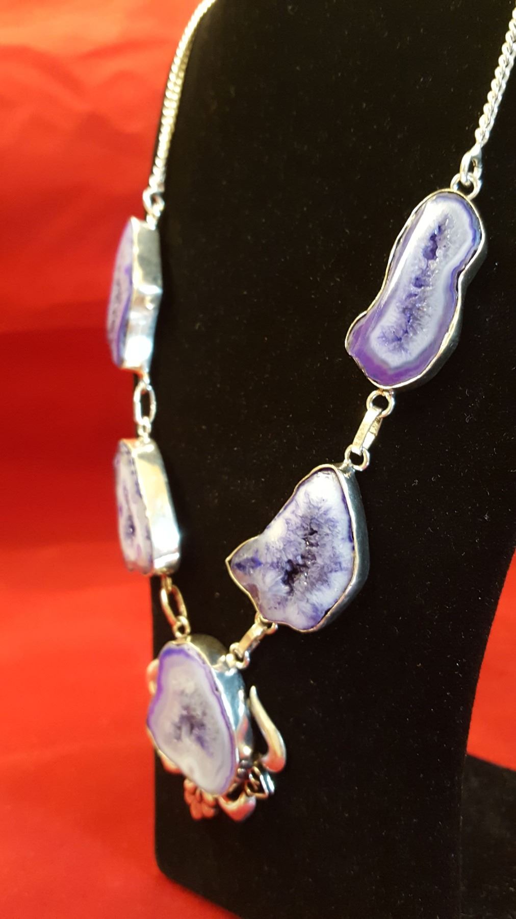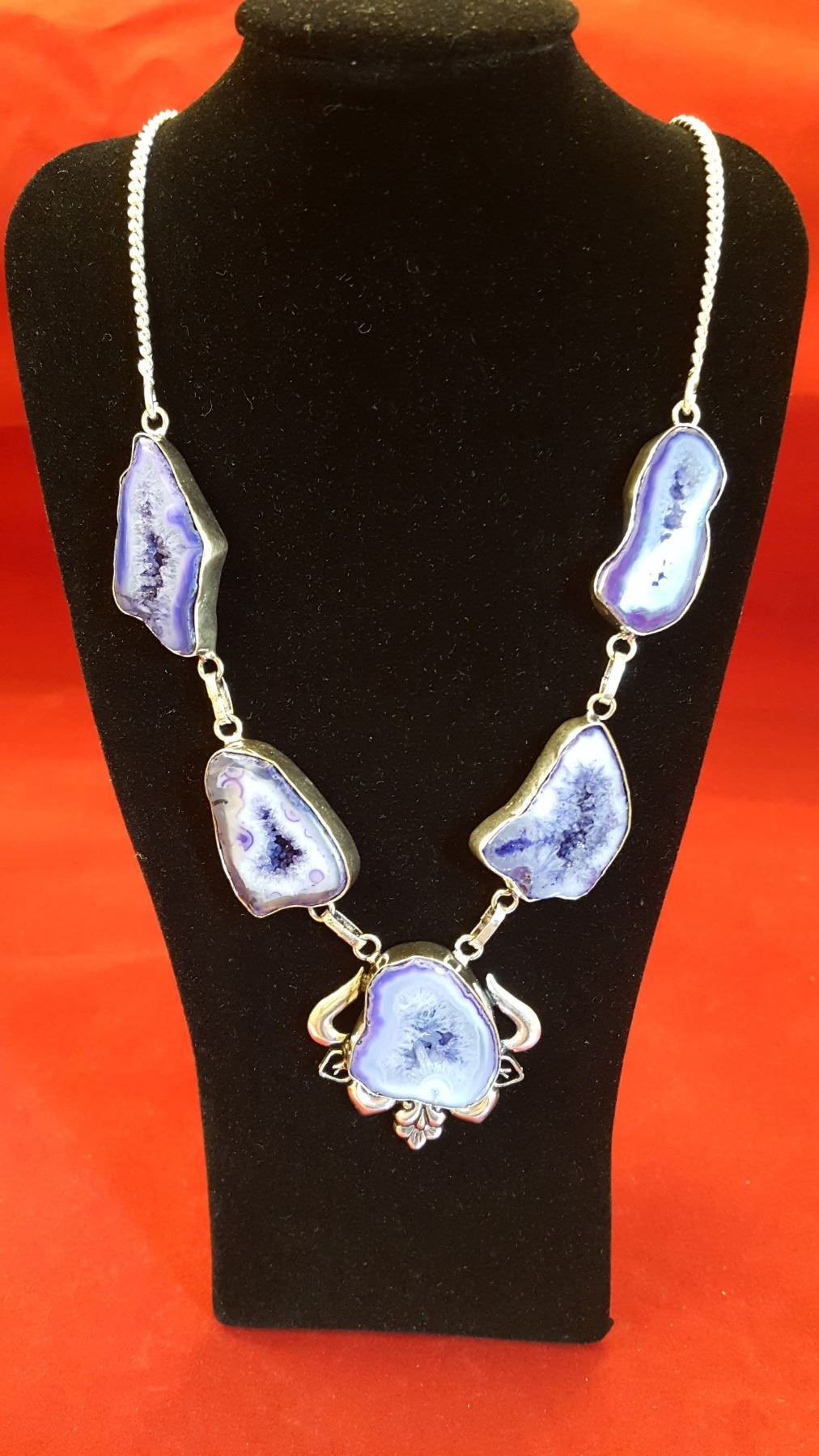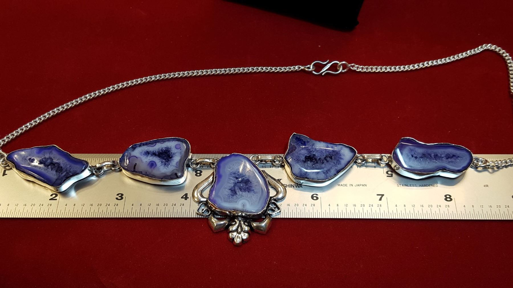135ct highly polished druzy necklace. Mounted in .925 sterling silver. Total length is 21 inches long. Total weight is 40 grams.