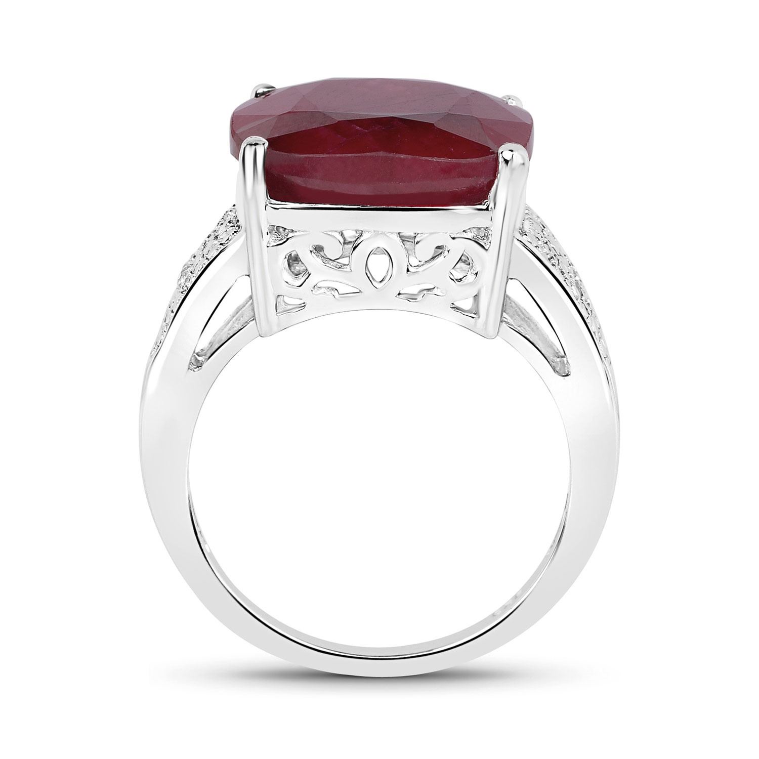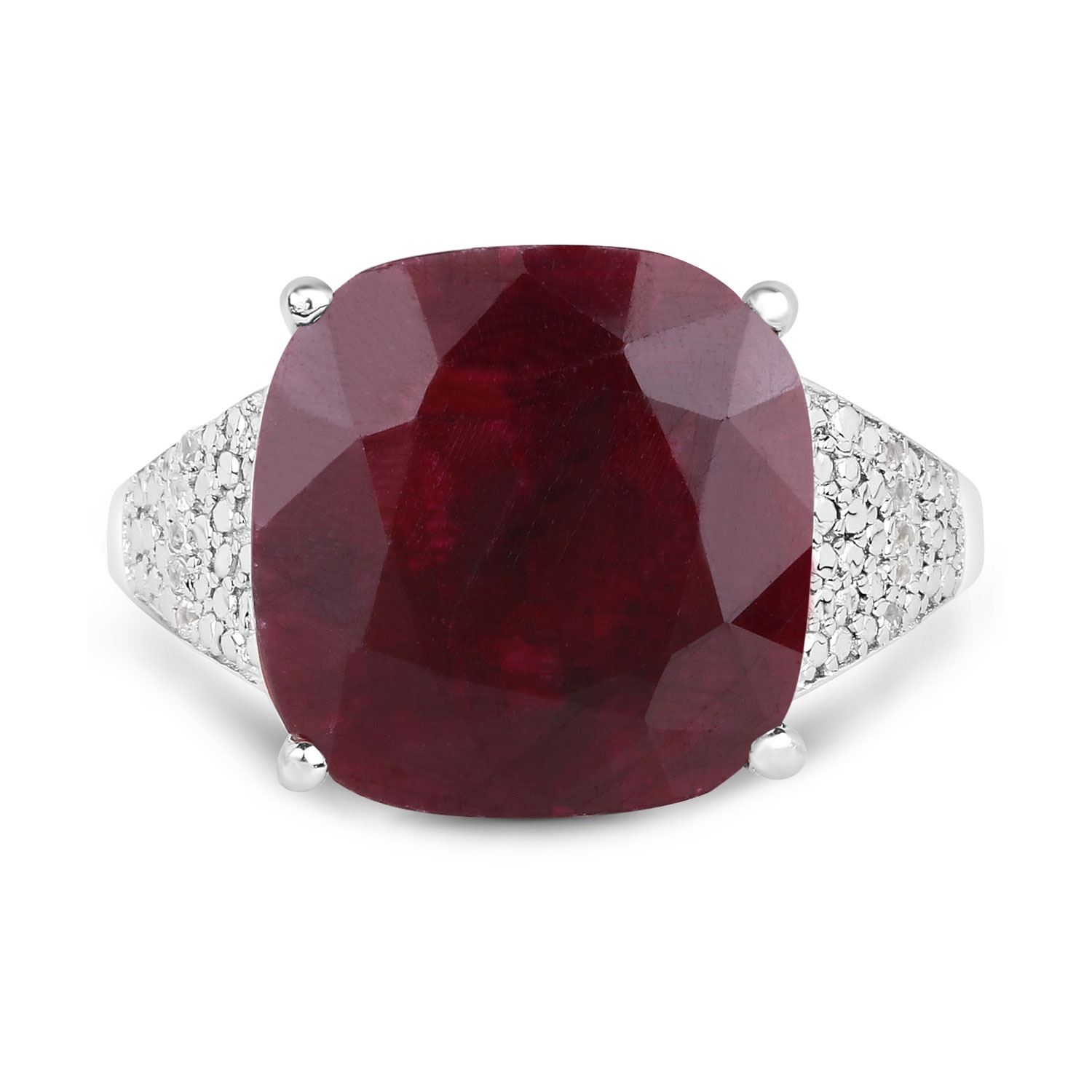 One cushion cut Dyed Ruby with a total weight of 14.42cts. 10 White Topaz stones with a total weight of 0.05cts. Weight of ring is 6.7 grams. Ring size 7.