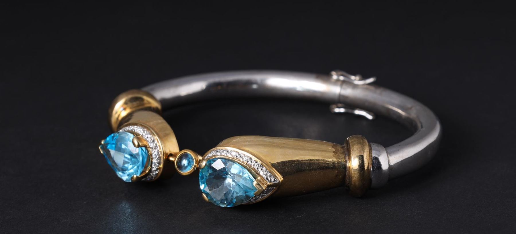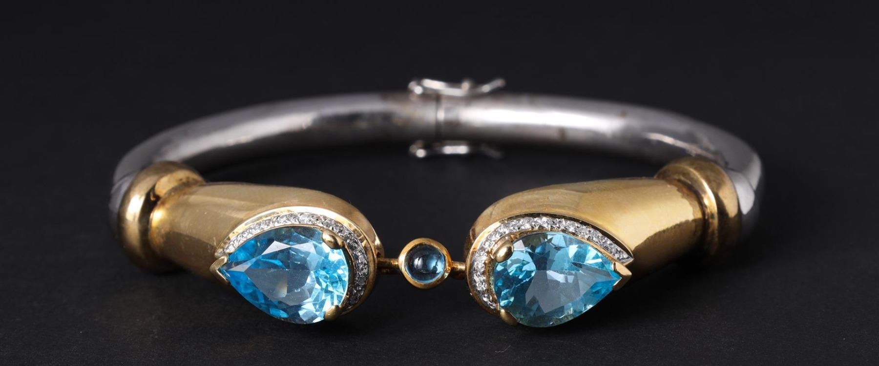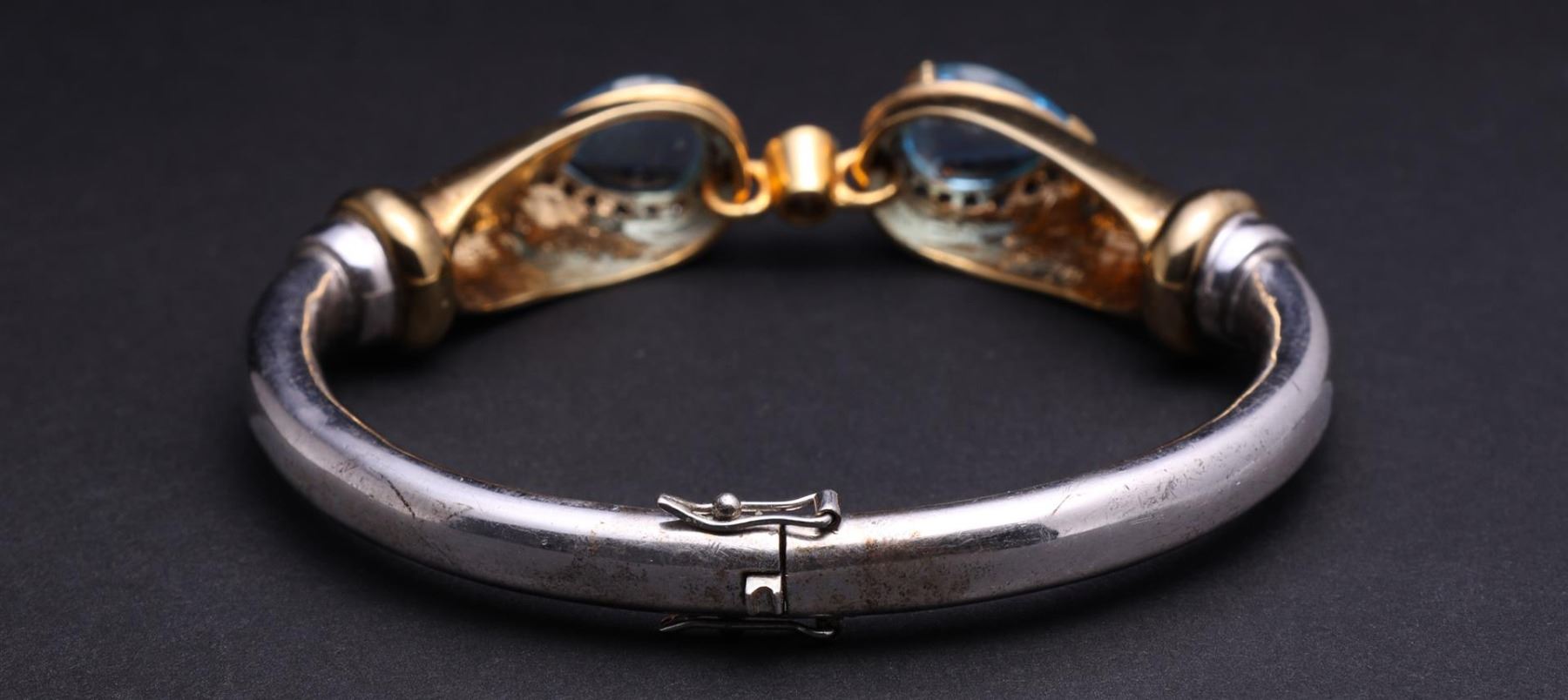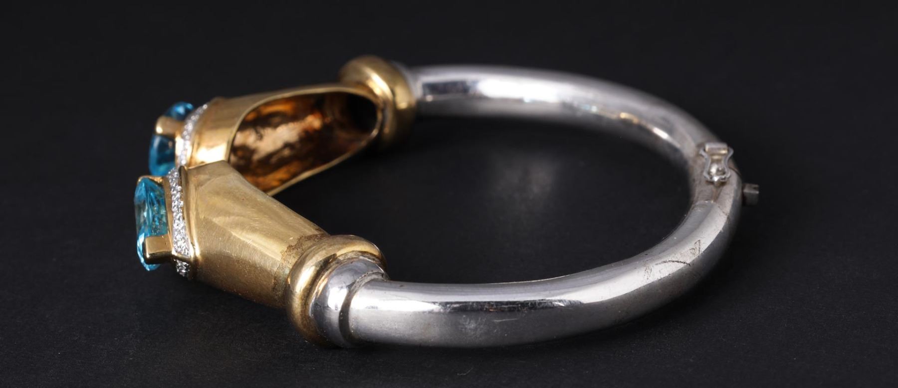 Sterling Silver, 14K Yellow Gold & Blue Topaz Split Bracelet containing three blue topaz weighing approximately 8.0 cts. Thirty round brilliant cut diamonds weighing approximately 0.25 cts. Total weight of 43.1 gm. Estimated retail value $4,800.