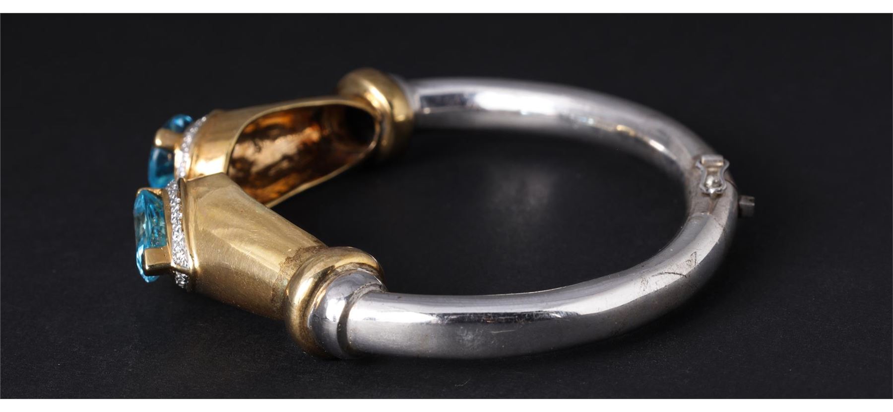 Sterling Silver, 14K Yellow Gold & Blue Topaz Split Bracelet containing three blue topaz weighing approximately 8.0 cts. Thirty round brilliant cut diamonds weighing approximately 0.25 cts. Total weight of 43.1 gm. Estimated retail value $4,800.