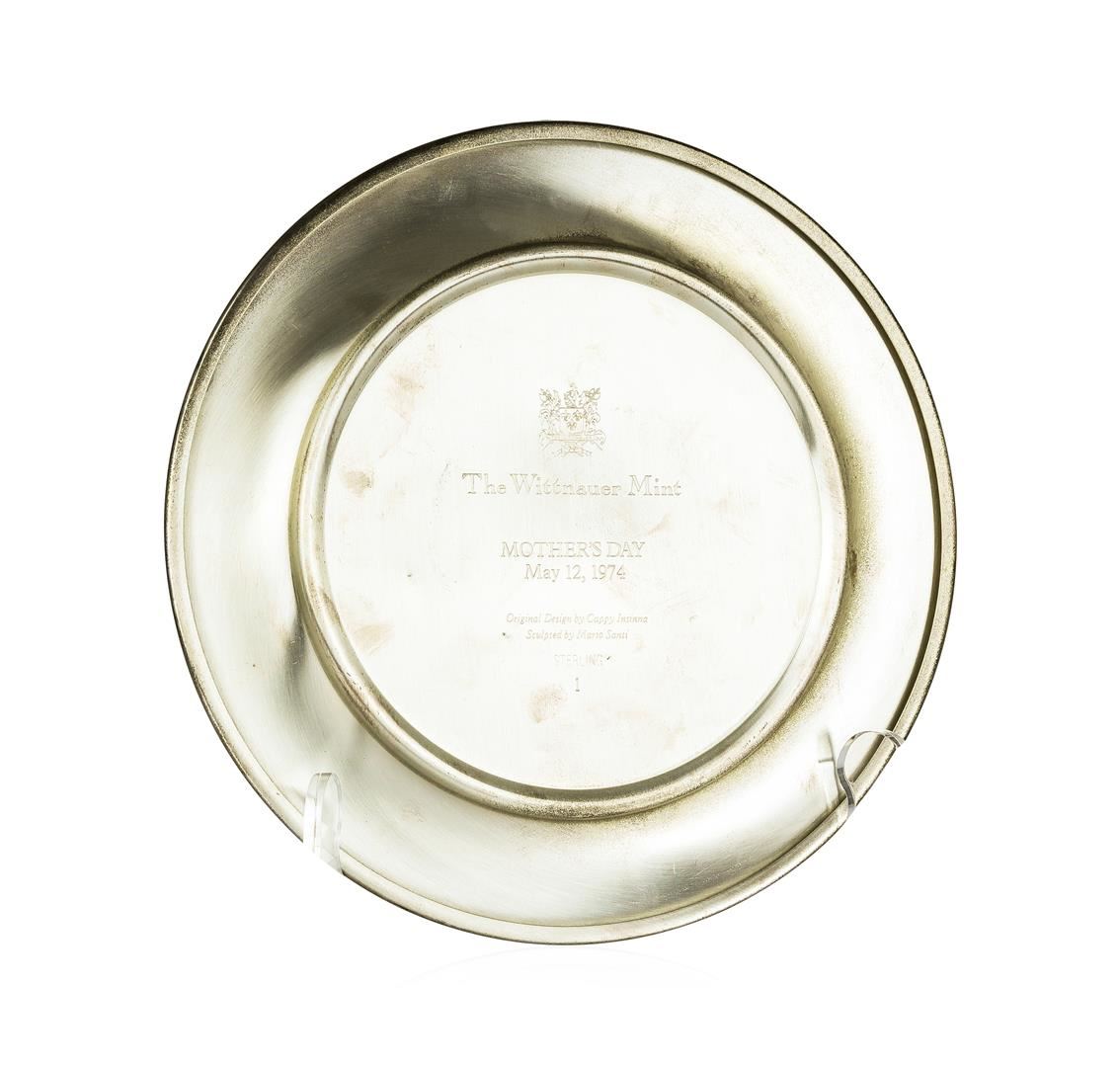 One sterling silver 1974 Mother's Day plate from the Wittnauer Mint featuring the design of a mother and her two children by Cappy Insinna and sculpted by Mario Santi. The piece is in very good vintage condition with only some minor scratches and some wear of the finish. Solid sterling silver, weighing 325 grams.