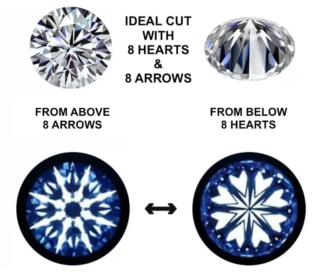 Cut - Round Brilliant Cut (8 Hearts & 8 Arrows) and near Flawless.