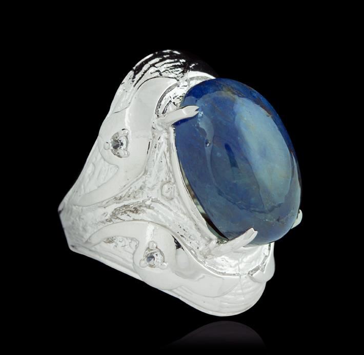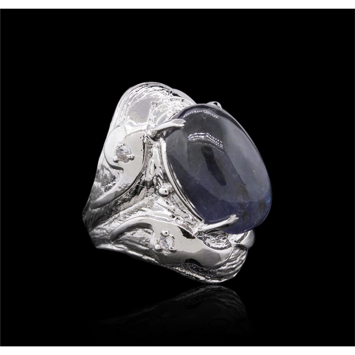 One electronically tested 925 silver ladies cast tanzanite and white sapphire ring with a bright polish finish. Condition is good. The featured tanzanite is set within elaborate patterned shoulders with white sapphire accents, completed by a four millimeter wide band. Identified with markings of "925". Containing: One prong set oval cabochon cut natural tanzanite, measuring 19.60 x 13.10 x 8.80mm, approximate weight of 22.04ct., clarity is severely included, type I, medium dark, very slightly grayish, violetish blue color, (GIA Vb 6/3), cut is good. Transmitting light with no distortion, transparent. Colored stone grading report attached. Graded in the setting. Tanzanite is a very rare gemstone that is only fund in the country of Tanzania. Originally discovered in 1967. Tiffany & Company, named the stone tanzanite. It is found in the Usumburu mountains that border the Umba valley of northern Tanzania. Tanzanite occurs in gray, brown, violet, blue, reddish-purple, & green. The gem is interesting because of its exceptional pleochroism. Rotated in different directions a tanzanite will exhibit multiple changes of color. Tanzanite has a low tolerance to ultrasonic cleaning, and should not be cleaned using this method. Total weight of Tanzanite 22.04ct. Total weight of Ring 15.93gm. AIG Appraised at $2,425.00.