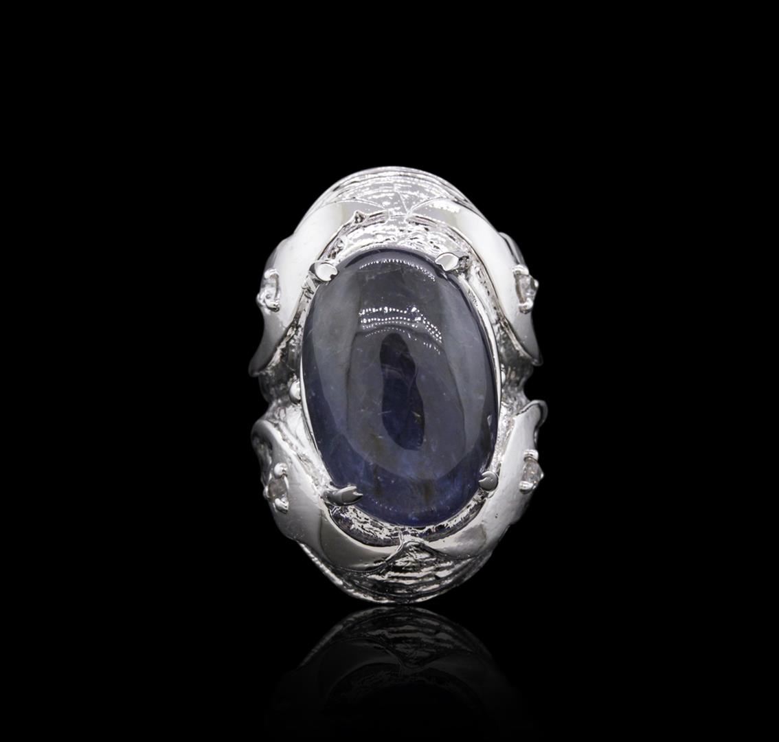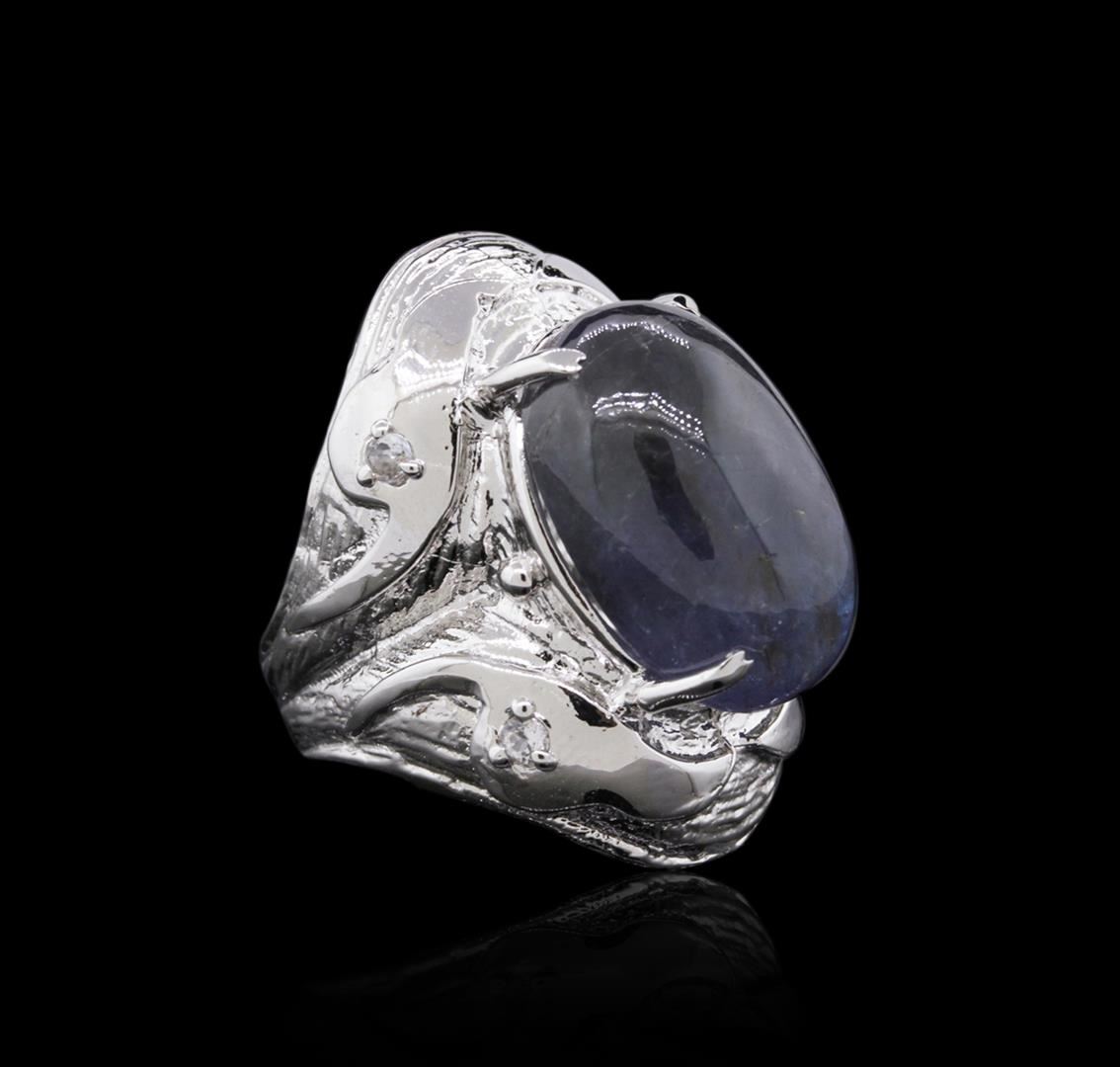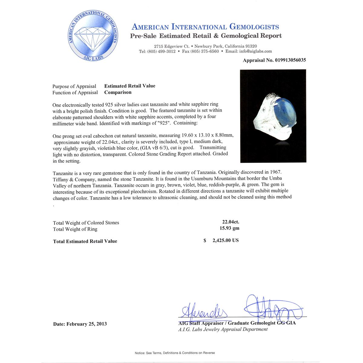 One electronically tested 925 silver ladies cast tanzanite and white sapphire ring with a bright polish finish. Condition is good. The featured tanzanite is set within elaborate patterned shoulders with white sapphire accents, completed by a four millimeter wide band. Identified with markings of "925". Containing: One prong set oval cabochon cut natural tanzanite, measuring 19.60 x 13.10 x 8.80mm, approximate weight of 22.04ct., clarity is severely included, type I, medium dark, very slightly grayish, violetish blue color, (GIA Vb 6/3), cut is good. Transmitting light with no distortion, transparent. Colored stone grading report attached. Graded in the setting. Tanzanite is a very rare gemstone that is only fund in the country of Tanzania. Originally discovered in 1967. Tiffany & Company, named the stone tanzanite. It is found in the Usumburu mountains that border the Umba valley of northern Tanzania. Tanzanite occurs in gray, brown, violet, blue, reddish-purple, & green. The gem is interesting because of its exceptional pleochroism. Rotated in different directions a tanzanite will exhibit multiple changes of color. Tanzanite has a low tolerance to ultrasonic cleaning, and should not be cleaned using this method. Total weight of Tanzanite 22.04ct. Total weight of Ring 15.93gm. AIG Appraised at $2,425.00.