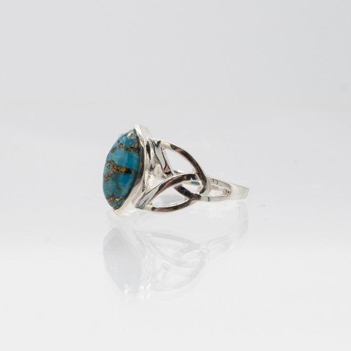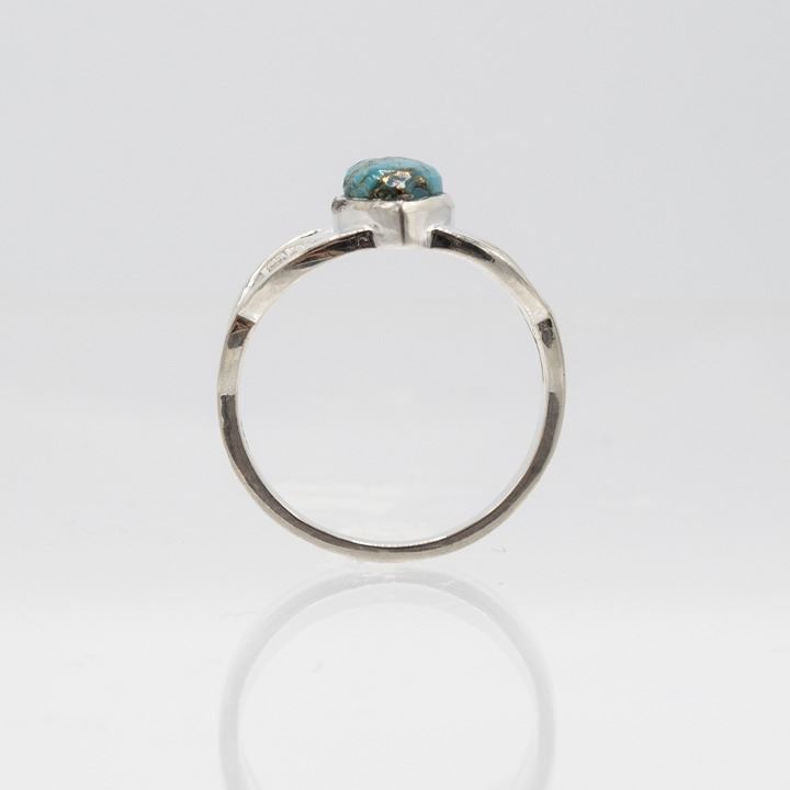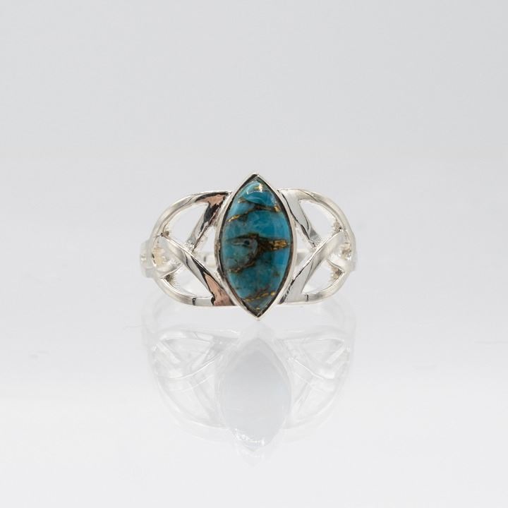 Ladies sterling silver turquoise ring featuring a bezel set marquis cabochon cut turquoise weighing approx. 2.00ct. Accented with twisted rope detailing. Finger size 8. Weight 3.4 grams.