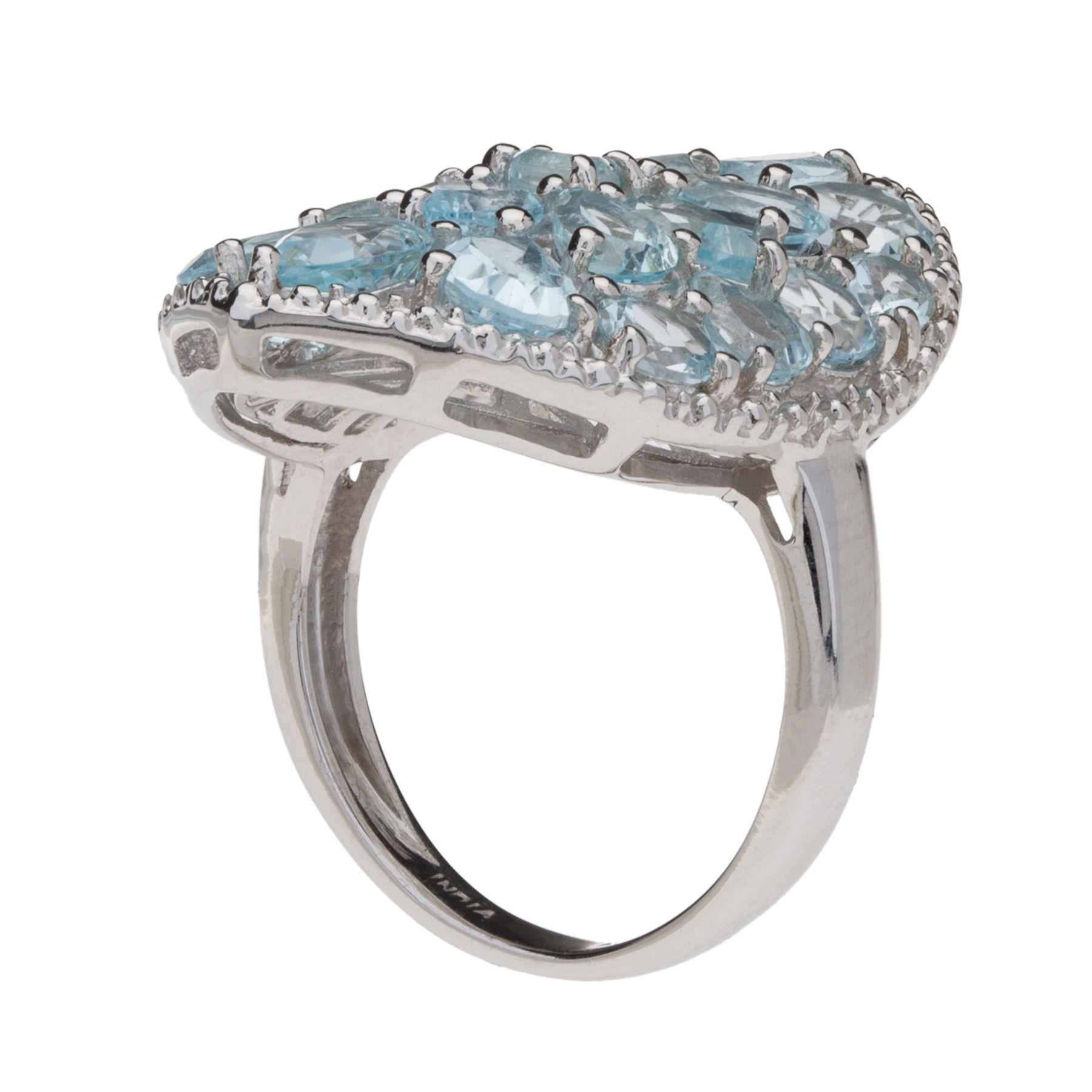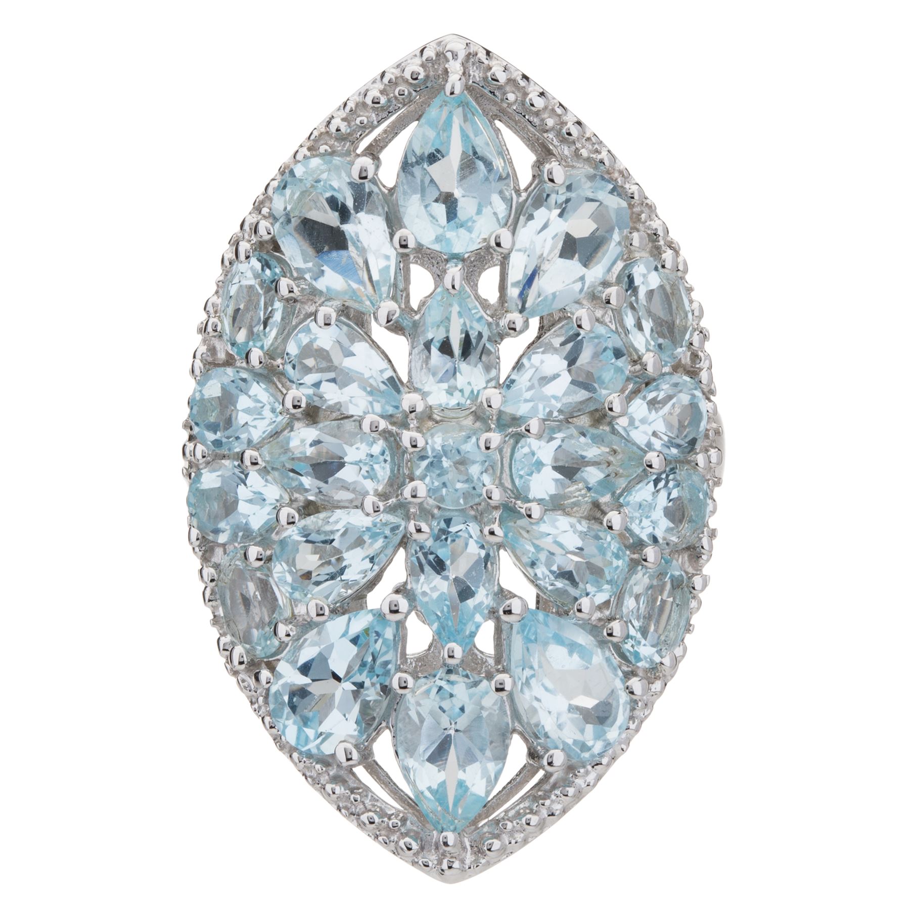 Crafted from 925 sterling silver, this ravishing ring features a shield design encrusted with pear, oval and round cut Sky blue Topaz gemstones. Beaded detailing adorns the edges while a cut-out design completes the undergallery. Finish your favorite fashions with a sparkling touch of drama! • Genuine Sky Blue Topaz