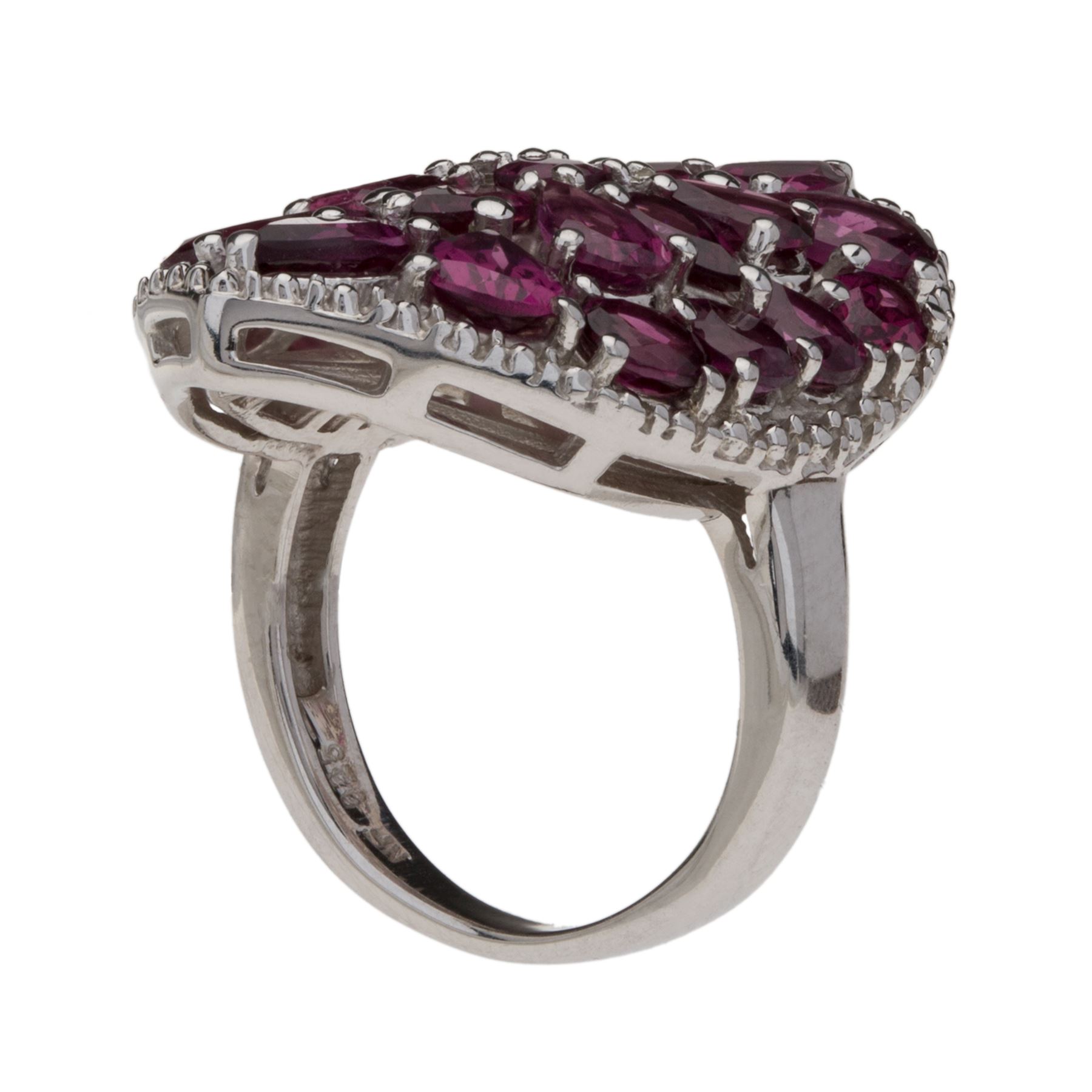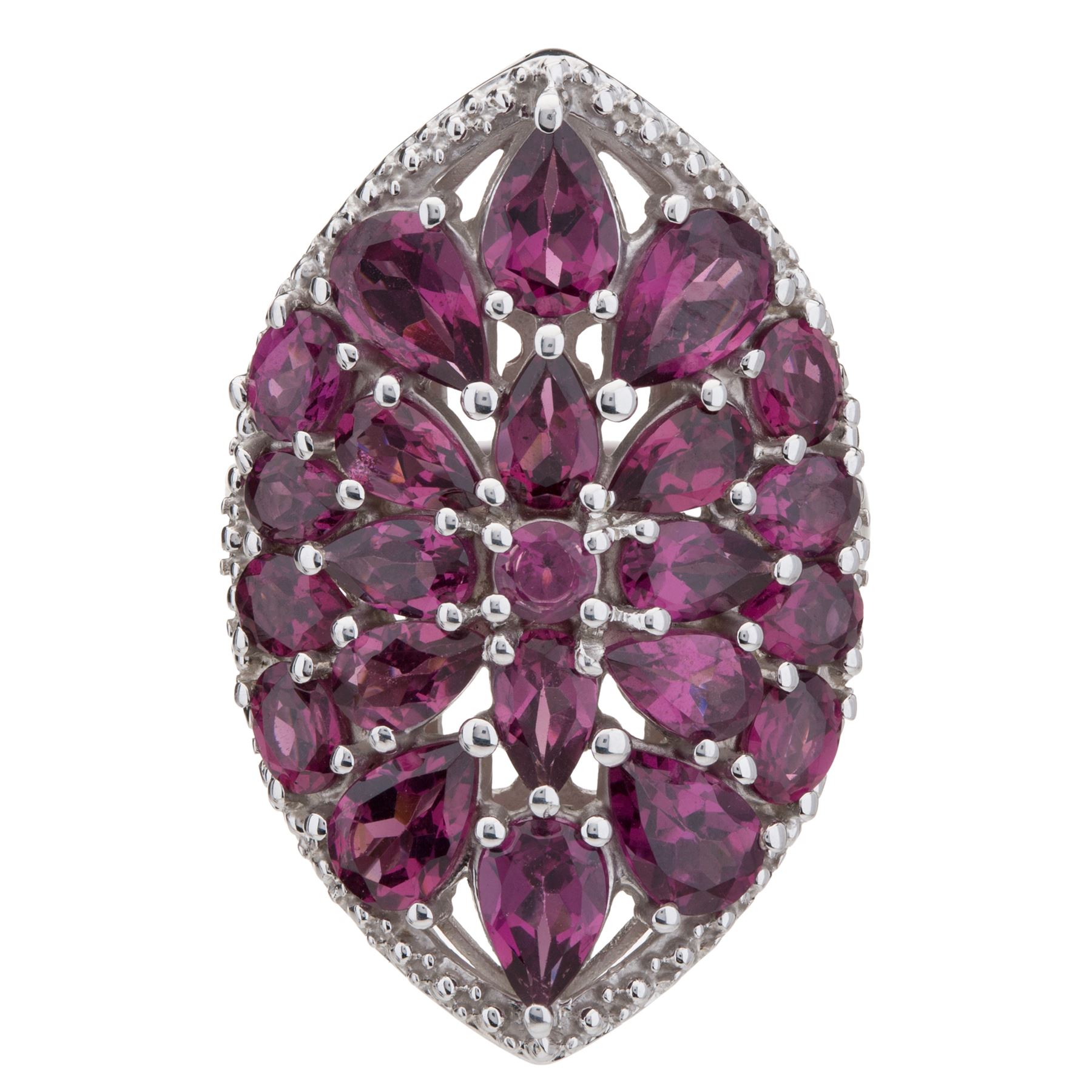 Crafted from 925 sterling silver, this ravishing ring features a shield design encrusted with pear, oval and round cut rhodolite garnet gemstones. Beaded detailing adorns the edges while a cut-out design completes the undergallery. Finish your favorite fashions with a sparkling touch of drama! • Genuine rhodolite garnet