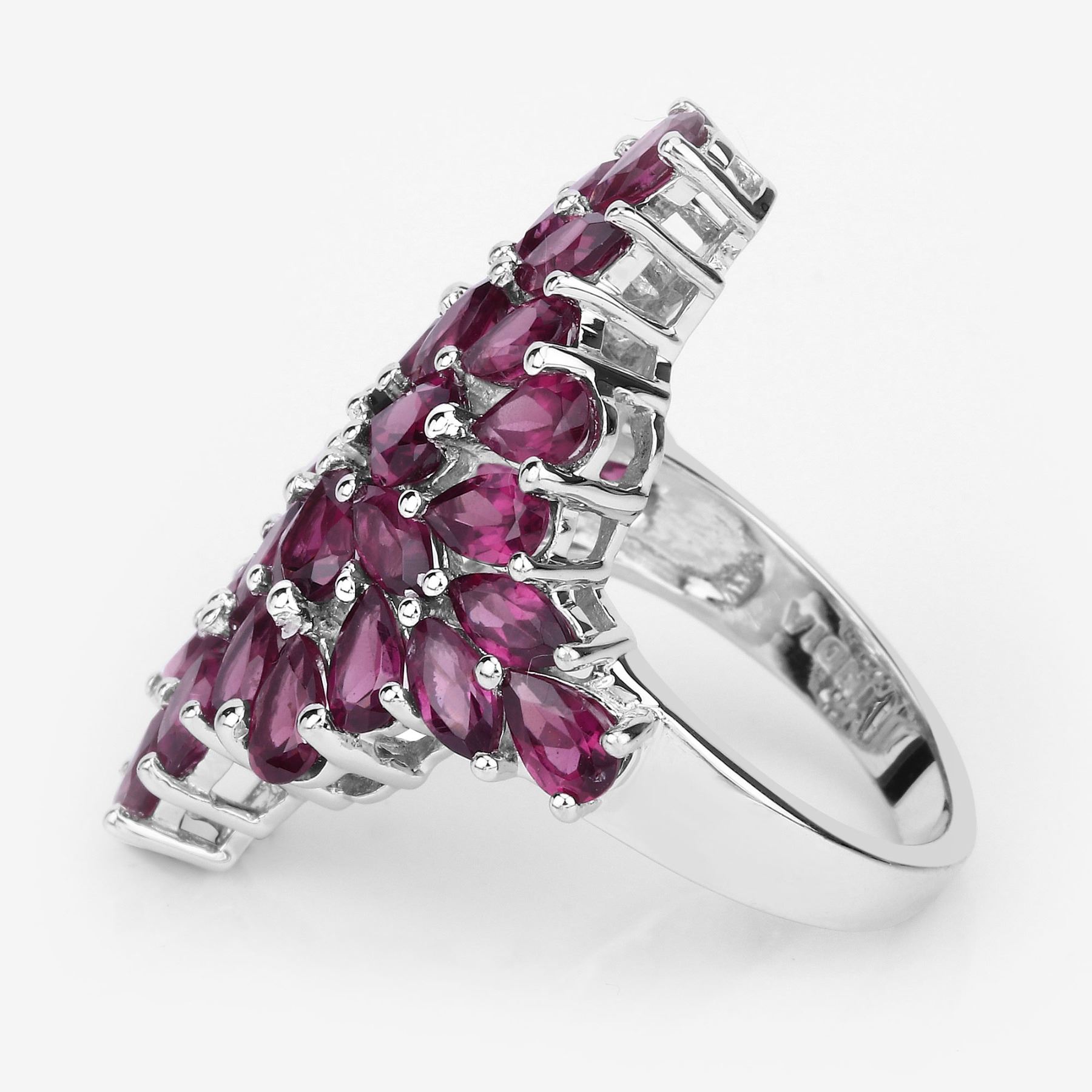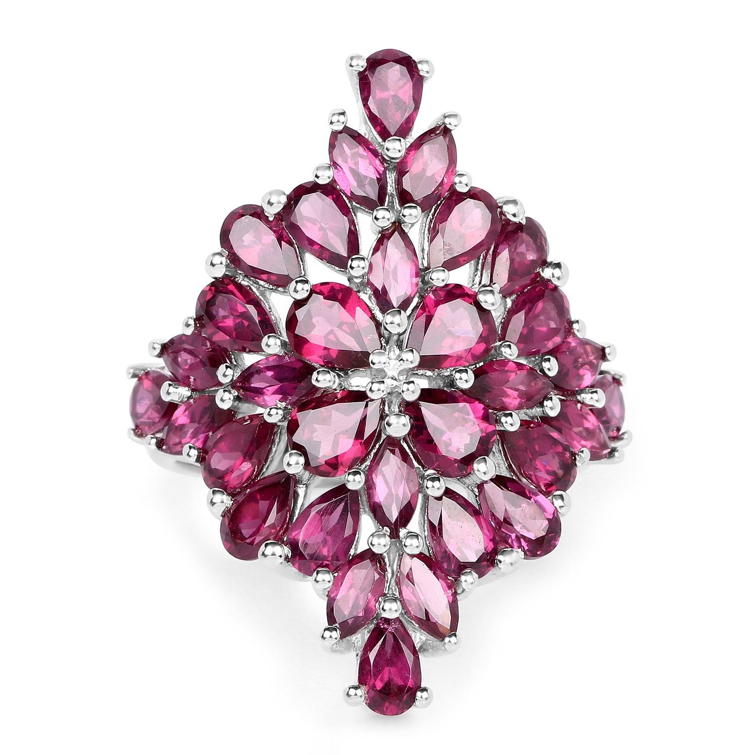Natural rhodolite garnets defines this rhodium?plated .925 sterling silver ring, arranged in a mix of pear and marquise shapes for a deep red, petal?like spread. Four 5×4?mm pears (1.40?ctw), sixteen 5×3?mm pears (4.32?ctw), and twelve 5×2.5?mm marquise stones (1.80?ctw) combine for 32 stones and a total of 7.52?ctw. The piece carries the 925?QJ™?IN stamp and a substantial 7.27?gram presence, shaped as a women’s January?birthstone cluster with broad 24.64?mm × 32.00?mm dimensions and a low 5.84?mm rise. Ring size 7.