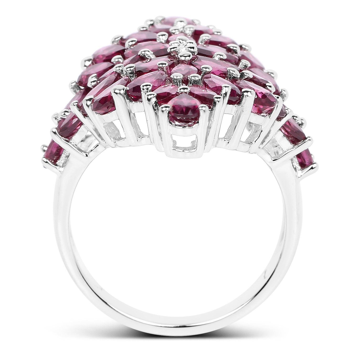 Natural rhodolite garnets defines this rhodium?plated .925 sterling silver ring, arranged in a mix of pear and marquise shapes for a deep red, petal?like spread. Four 5×4?mm pears (1.40?ctw), sixteen 5×3?mm pears (4.32?ctw), and twelve 5×2.5?mm marquise stones (1.80?ctw) combine for 32 stones and a total of 7.52?ctw. The piece carries the 925?QJ™?IN stamp and a substantial 7.27?gram presence, shaped as a women’s January?birthstone cluster with broad 24.64?mm × 32.00?mm dimensions and a low 5.84?mm rise. Ring size 7.