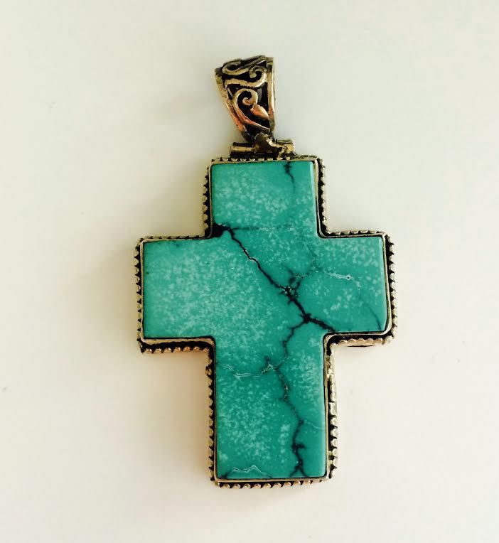 Sterling Silver .925 Cross Design Turquoise Pendant 22.02g 35x55mm