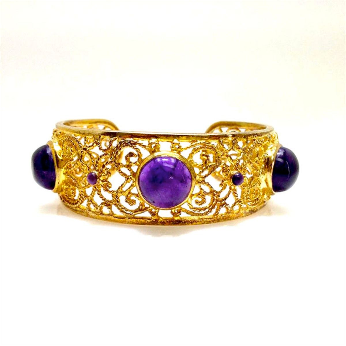 Sterling Silver .925 Filigree Amethyst Gold tone Cuff, 35.21gr
